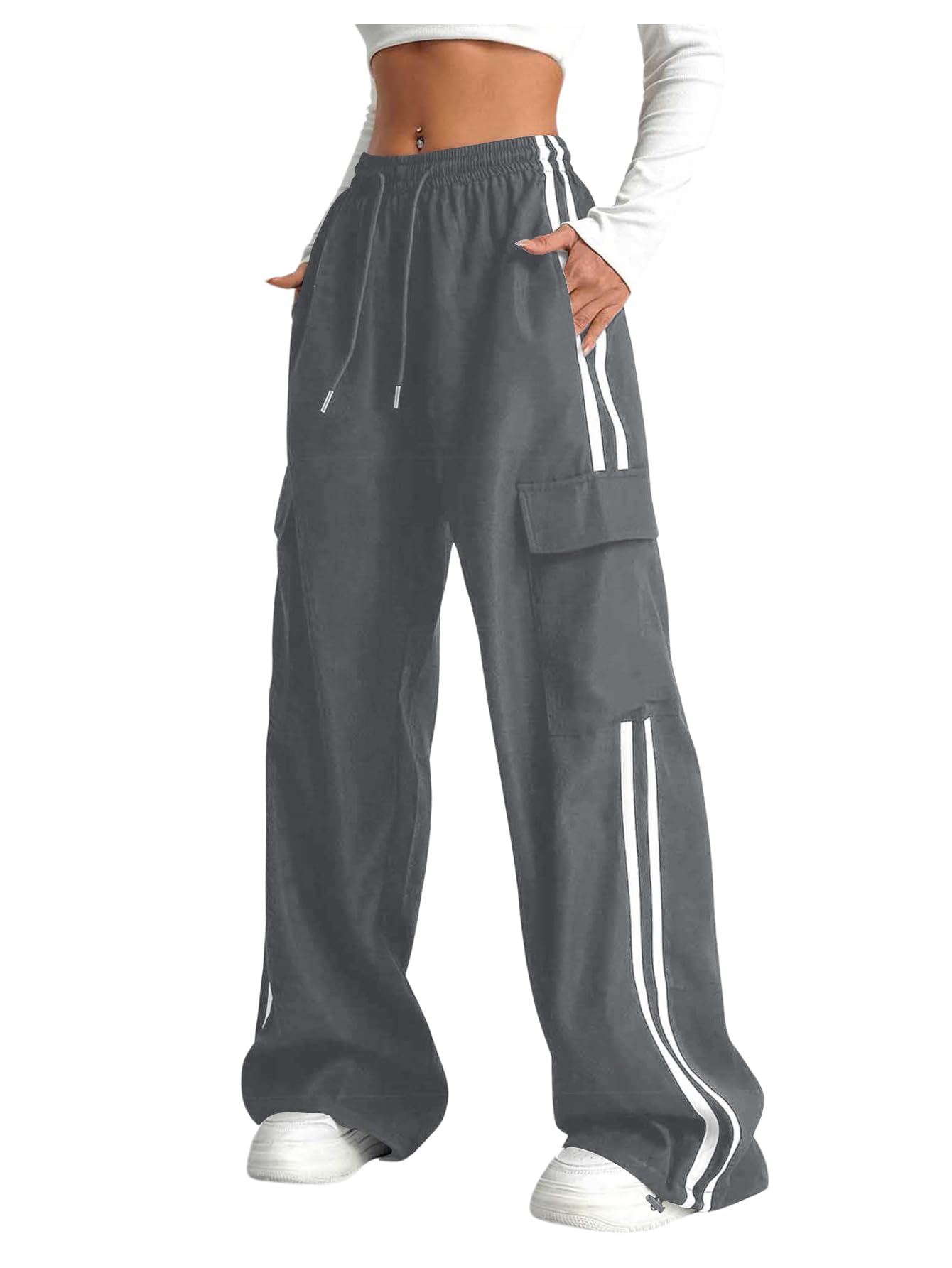 Design: Casual loose parachute pants for women, baggy sweatpants, ankle full length, wide leg trousers, straight leg pants, elasticized stretchy waistband for a flexible fit, simple but versatile, striking side stripes, welt side pockets, adjustable drawstring cuff, adding fashion to your overall dress