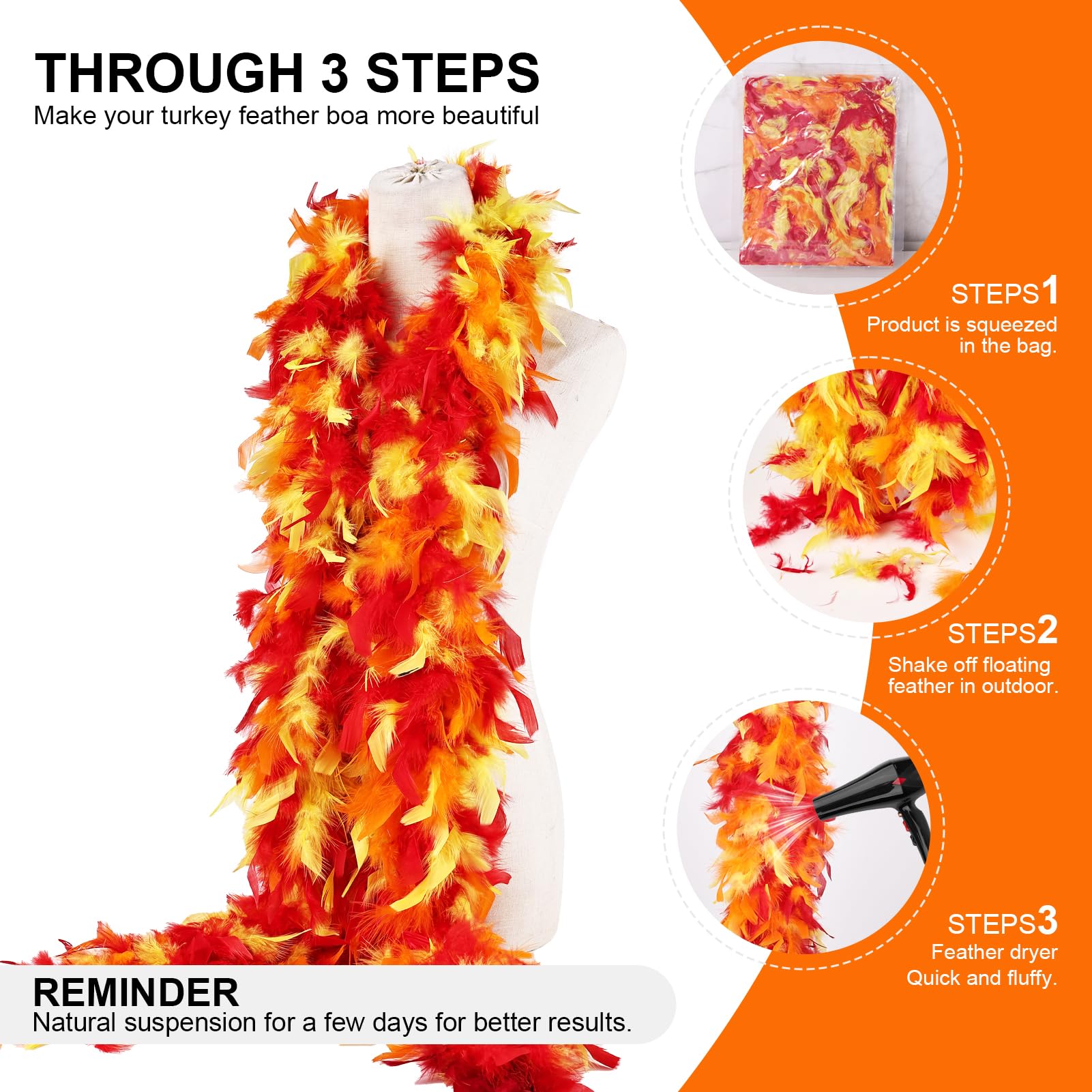 ❤️Precautions before use:Since our feathers are all natural and handcrafted,After you receive the boas, take them out of the package and shake them outdoor first, in order to get rid of debris and fallen feathers.Then hang it up for few hours before wearing. If you can hang up blowed few days, it will looks as the picture full and big.Of course,the longer you hang them up, the turkey feather boa will be more fluffy and the effect will be more stunning.