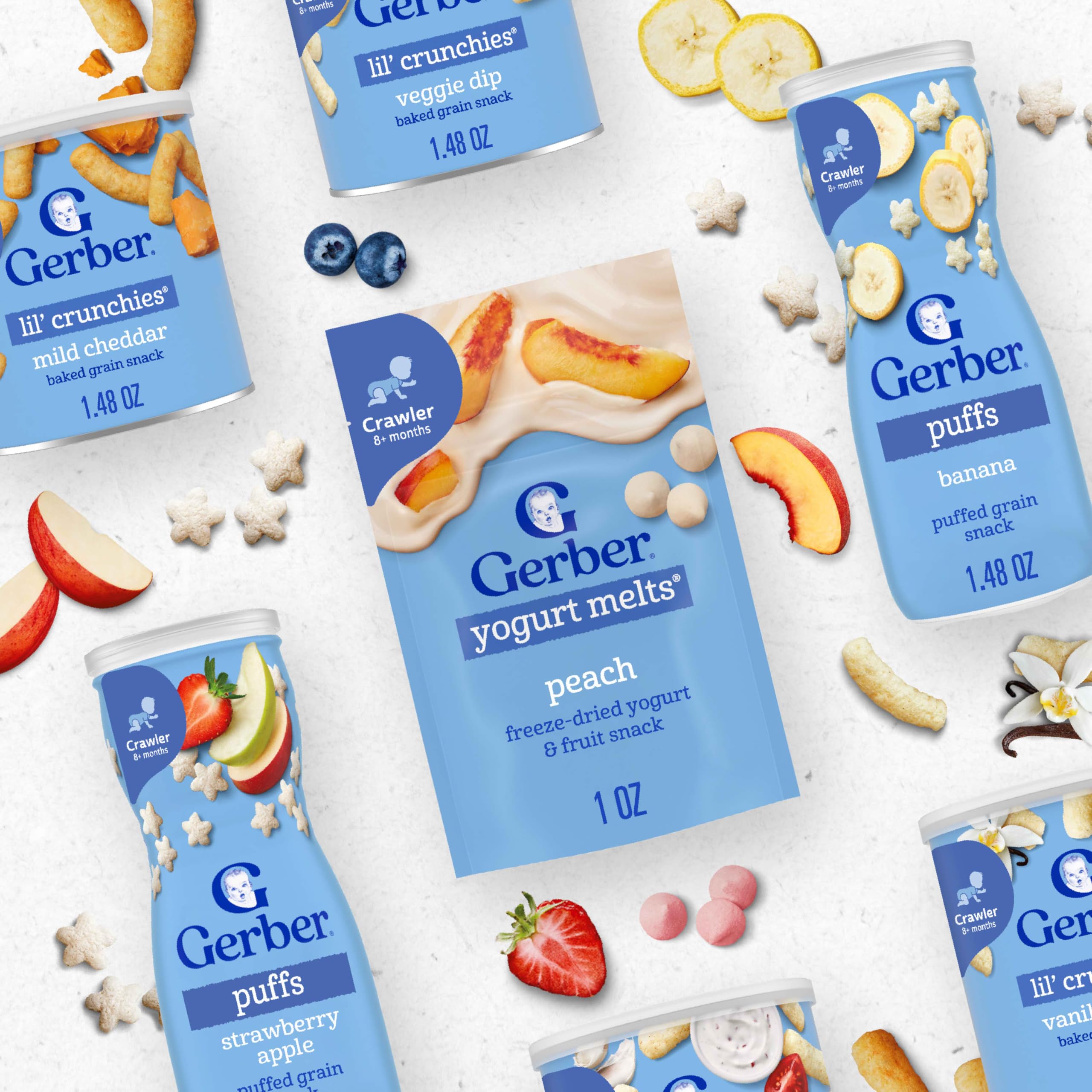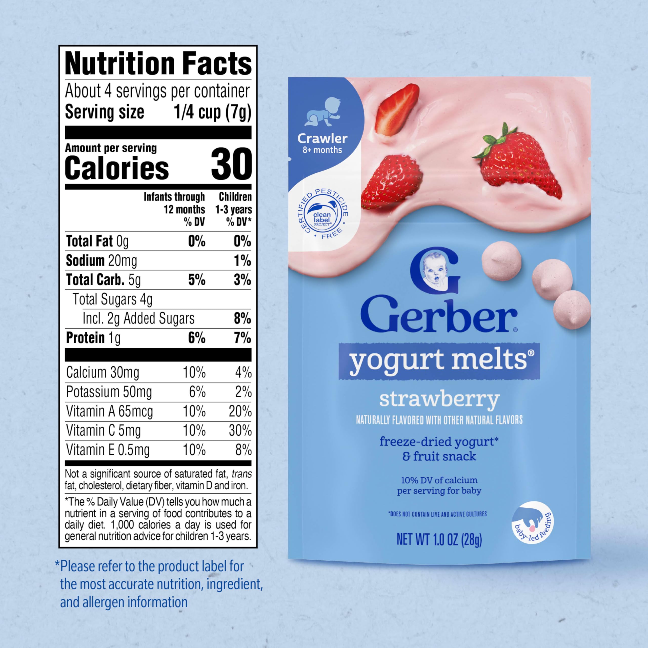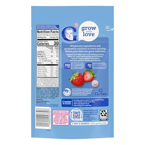 Product Description Gerber Strawberry Yogurt Melts are made with wholesome ingredients and strict quality standards just for babies. This baby finger food dissolves easily and is perfect for little hands learning to pick things up. Specially crafted to delight your little one, these melts are stage 3 baby food snacks--designed for children 8 months and older. Gerber understands the importance of providing nutritious food as your baby grows and develops, which is why this baby finger food is made with real fruit and real yogurt. Our dedication to quality and nutrition has been and always will be our highest priority. We're committed to being your partner in parenthood with strict quality standards, nutritious food & expert guidance. Gerber baby snacks are a trusted choice for countless families. *Does not contain live and active cultures Brand Story By Gerber
