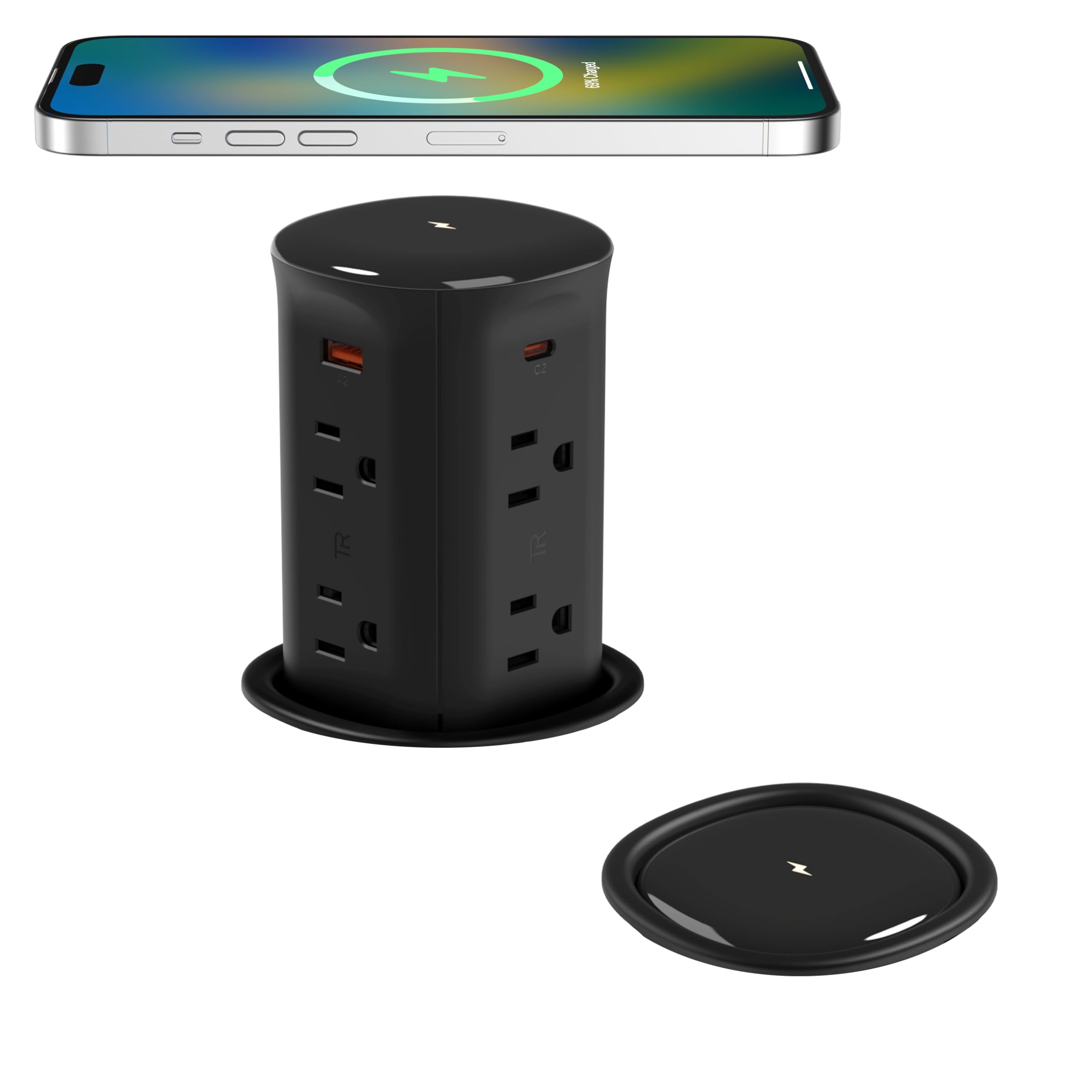 Maximize your workspace with this versatile pop-up outlet for countertops. Featuring a 3.15-inch (8 cm) desk wire hole insert, it seamlessly integrates into your desk or tabletop, providing a convenient and organized solution for your power needs. The 13-in-1 power strip offers 8 outlets and 4 USB ports, ensuring you can charge and power multiple devices simultaneously. The built-in 15W wireless charger allows you to charge your compatible devices wirelessly, eliminating the clutter of cables. With a 15-amp tamper-resistant receptacle, this space-saving recessed outlet prioritizes safety and convenience. Designed to be flush with your surface, it creates a sleek and unobtrusive look while maximizing your workspace. Upgrade your desk setup with this multifunctional pop-up outlet and enjoy a clutter-free, efficient workspace.