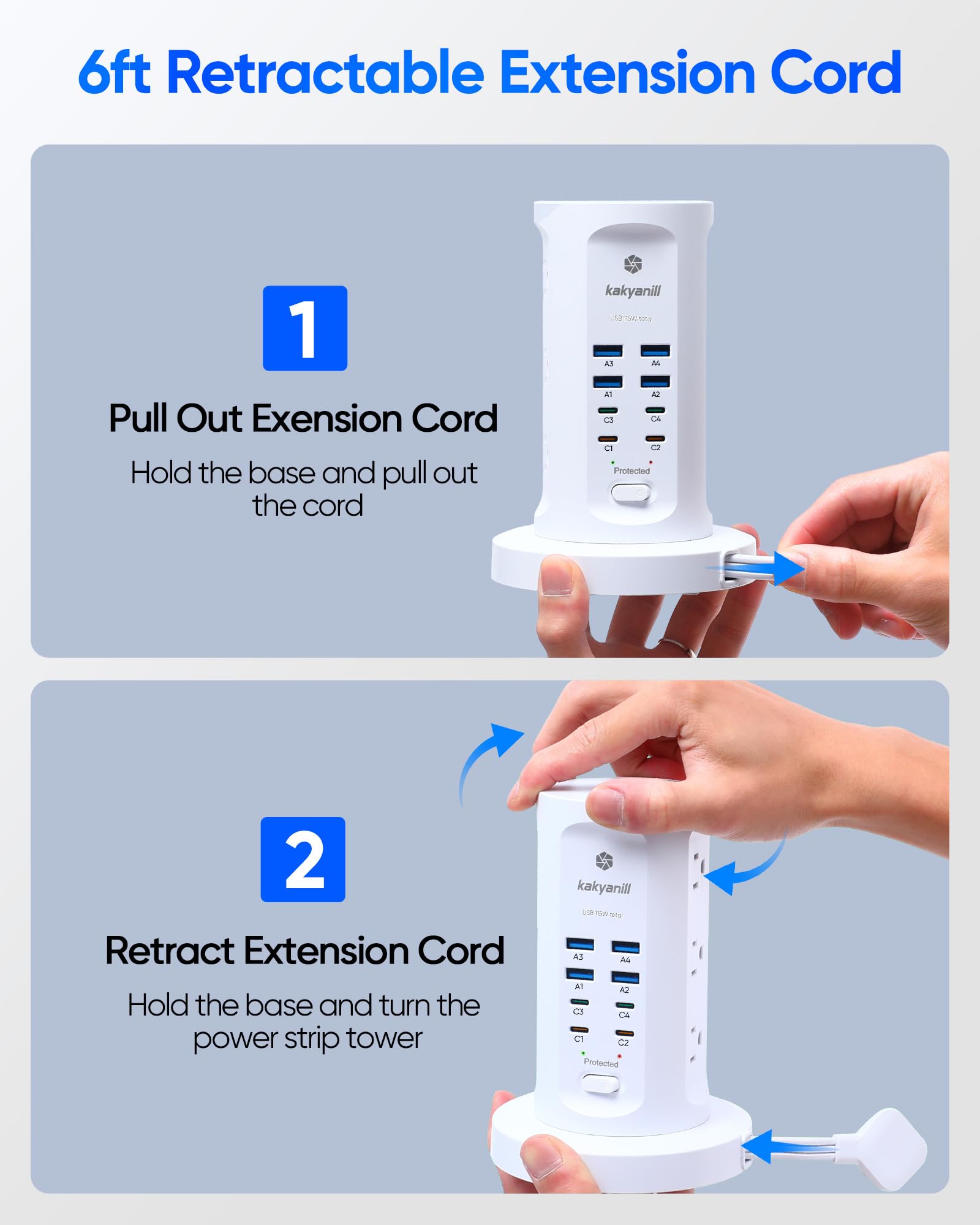 Space-Saving Tower Design & Retractable Cord. Maximize your workspace with a vertical tower layout and 6FT retractable flat cord. The ultra-slim 0.35" plug and 45° angled design fit seamlessly behind furniture, desks, or appliances, while the retractable base eliminates cord clutter—rotate to store or pull out for extended reach