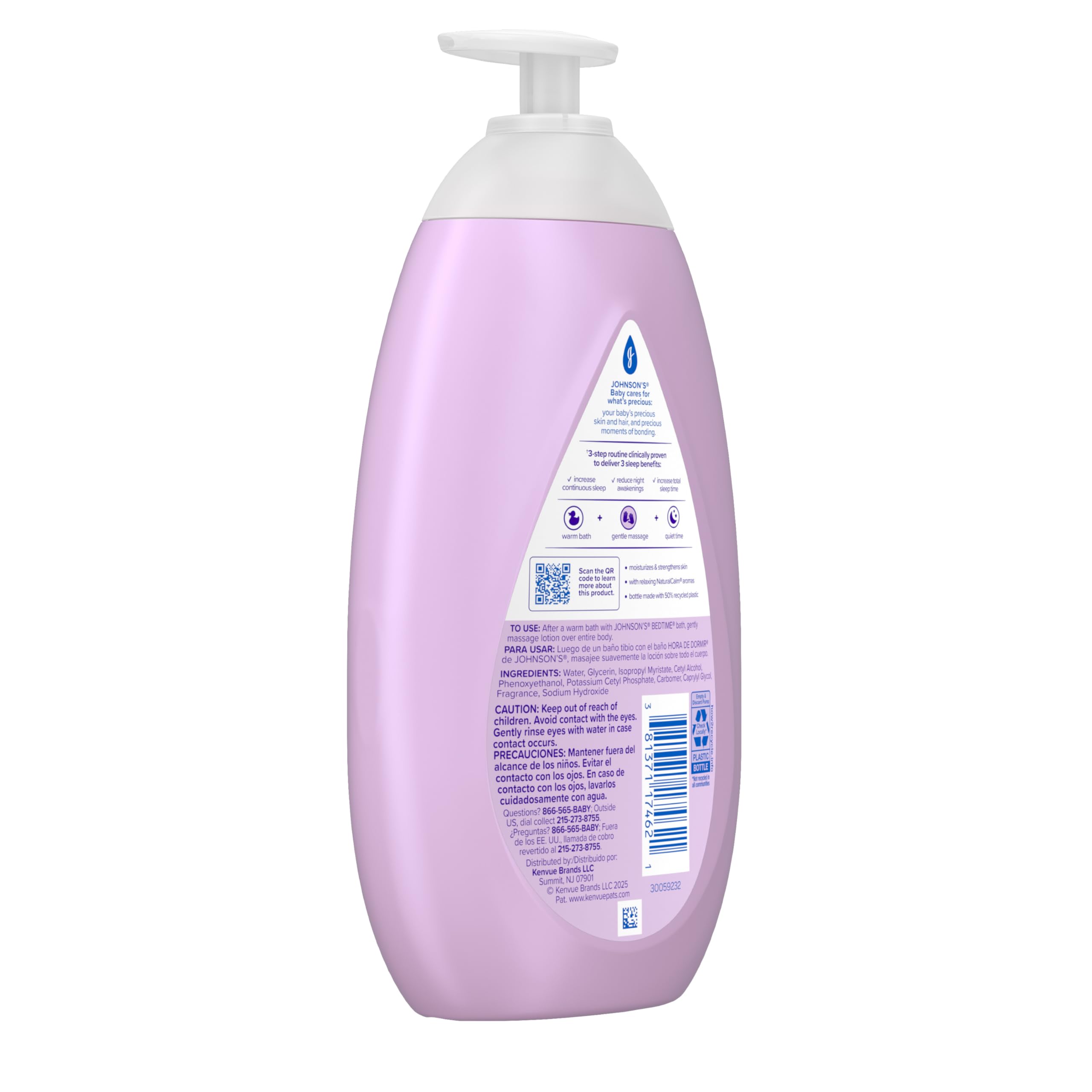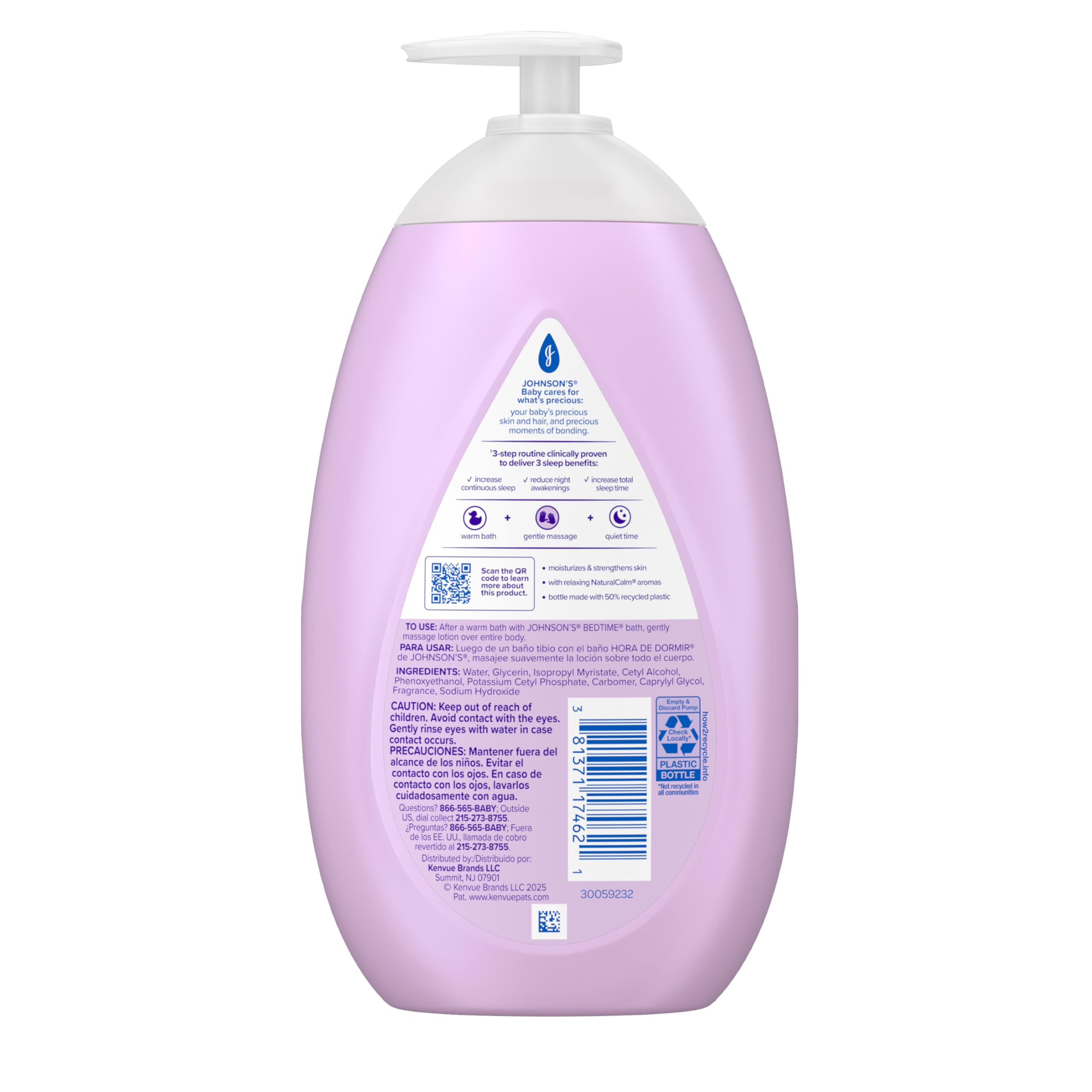 Gently moisturize your baby’s skin with Johnson’s Baby Bedtime Lotion, made with NaturalCalm aromas. This moisturizing bedtime baby lotion is clinically proven to provide 72 hours of hydration and helps nourish skin and strengthen the skin moisture barrier. The hypoallergenic, pH-balanced formula contains no added parabens and dyes and is suitable for nightly use on delicate skin. The only routine proven to help improve your baby’s sleep.* *Johnson's 3-Step clinically proven routine consists of warm bath, gentle massage, and quiet time. Clinically proven to deliver 3 sleep benefits: Increase continuous sleep, Reduce night awakenings, Increase total sleep time Johnson’s Baby cares for what’s precious: your baby’s precious skin and hair, and precious moments of bonding. World’s #1 Baby & Child Care Brand* *Source Euromonitor International Limited; Beauty and Personal Care 2025 ed. As per Baby and Child-Specific Products Category; all retail channels; value sales at RSP; 2024 data.