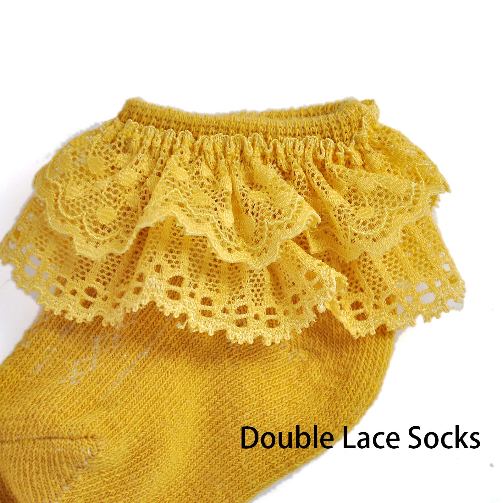 Description These layer lace trim socks will look super cute on your little girls. Made of a fabric blend for cozy softness and great fit.The socks will look great with a pair of Mary Jane's and a dress, and will add a touch of playfulness to your little girl's outfit. They are perfect for wearing to parties, events, holidays, church, for family portraits, dancing and more. Specification: Material:80% Cotton,17% Polyester,3% Spandex For season:Spring,summer,autumn, ATTENTION Boot Leagth maybe different between two pairs of the same size socks because of the elasticity of Spandex or the density of textile.The length of the difference is within 0.4 IN normally.