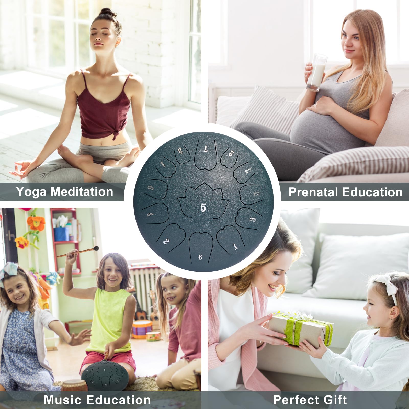 Wide range of applications: Tongue drums are suitable for adult and children's music education, yoga, concert accompaniment, psychotherapy and stress reduction, but also can be used as a rain drum, and the natural rainfall resonance, when the rain hit the tongue drum, it will emit a pleasant sound, so that you listen to the symphony of nature!
