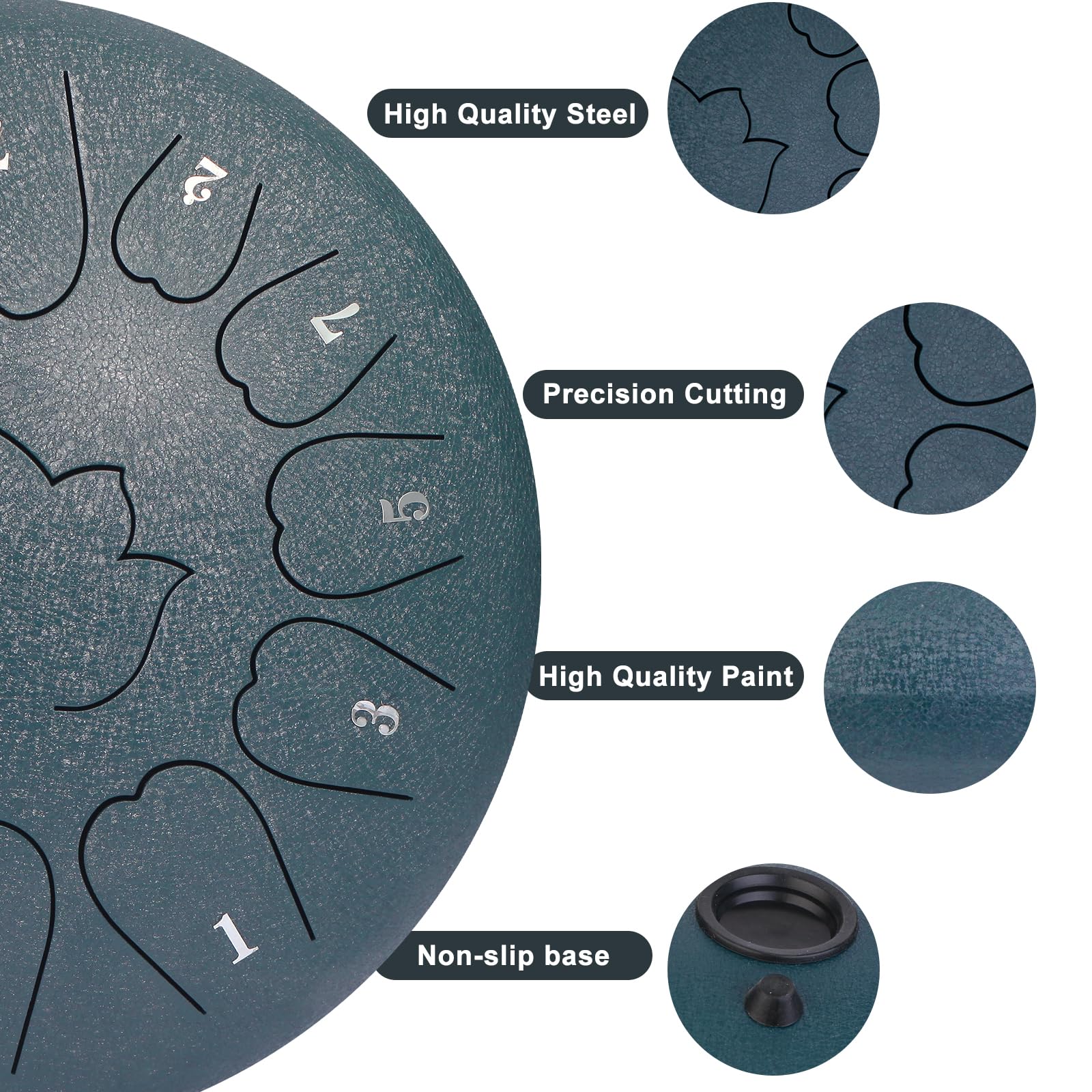 Set includes: 1*steel tongue drum, 1*drum bag, 2*drumsticks, 1*drumstick holder, 1*English sheet music, 4*finger pads, 2*spare note stickers, 1*silver grease pencil (if the digital stickers are worn out, use the grease pencil tfor a more logical, permanent mark)