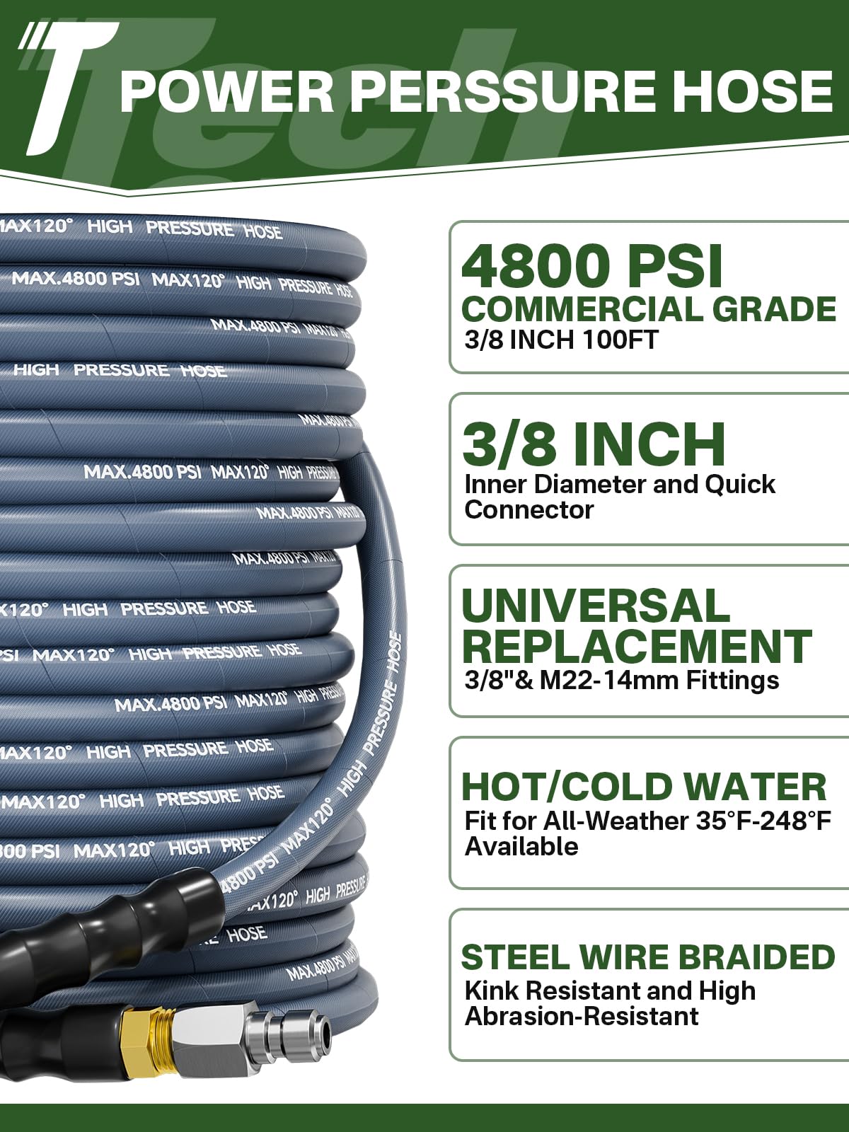 【Commercial Grade Pressure Washer Hose】3/8" power washer hose is made of high-quality synthetic rubber & tensile steel braid, MAX working pressure can reach 4800 PSI with 16000 PSI burst pressure, Withstands high temperatures up to 120℃ /248°F. designed for a commercial and industrial pressure washer for homework and business.