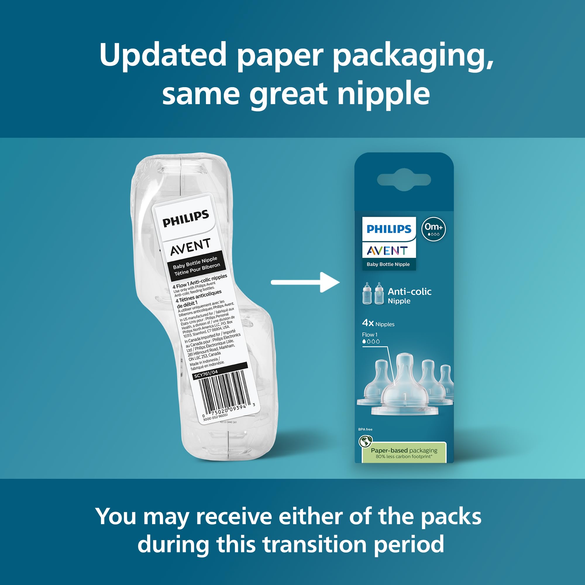 The Philips Avent Anti-colic nipple Flow 1 is the slowest-flow nipple in the range, which is great for newborns and breastfed babies learning to drink from a bottle. The anti-colic valve integrated into the nipple is designed to keep air away from your baby's tummy to reduce colic and discomfort. As your baby feeds, the valve flexes to allow air into the bottle to prevent vacuum buildup and vents it towards the back of the bottle. The nipple shape allows for a secure latch and the ribbed design helps prevent collapse for uninterrupted, comfortable feeding. The anti-colic nipple is made of flavorless, odorless, soft, BPA-free silicone that resists discoloring and stickiness. Philips Avent bottle nipples are available in different flow rates to keep up with your baby’s growth. We recommend replacing nipples every 3 months for hygiene reasons. Use Philips Avent Anti-colic bottles only with Philips Avent Anti-colic nipples. ¹ Based on global annual sales of nipple packs, using net weight of the plastic nipple case ² Compared to previous packaging