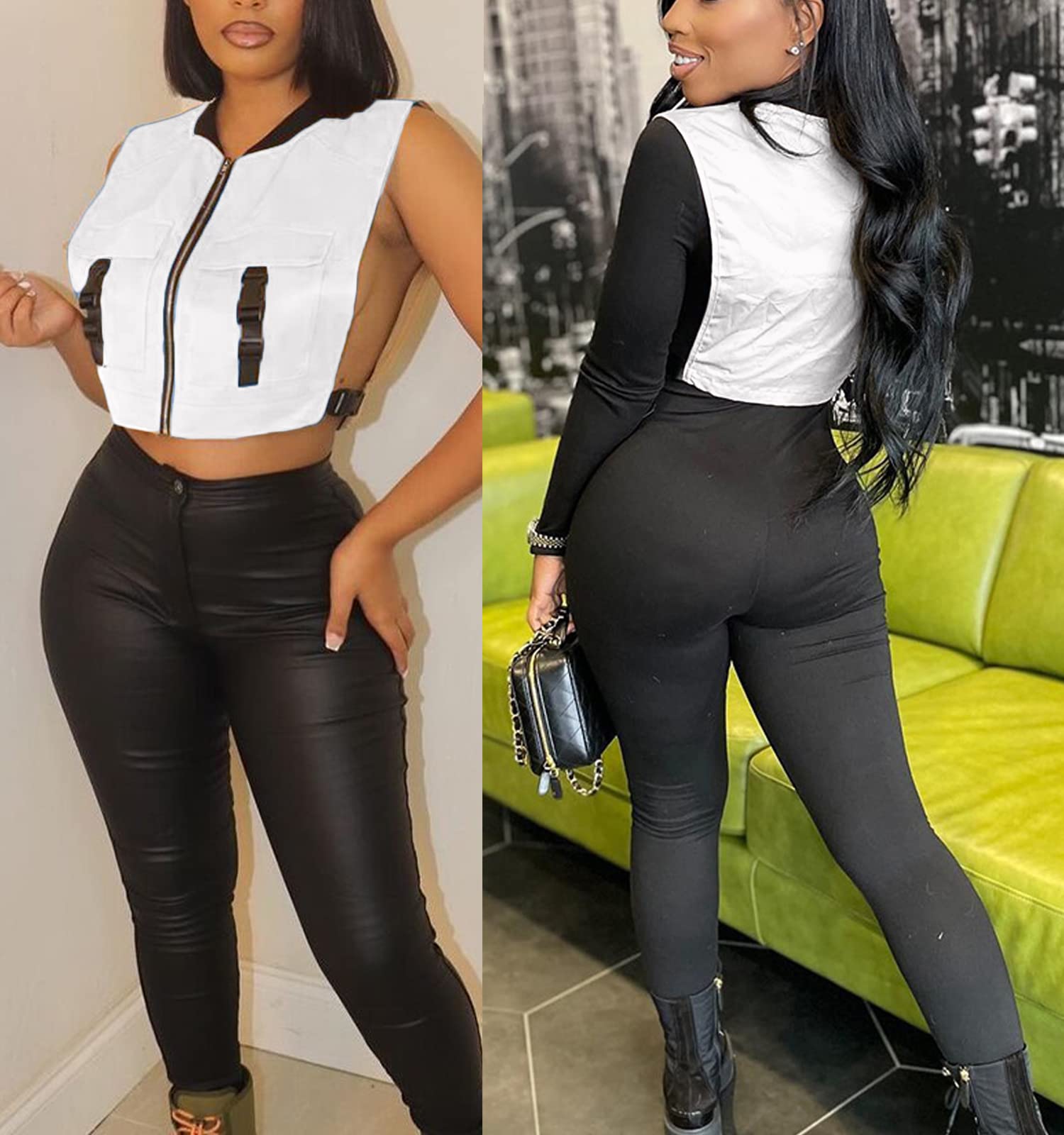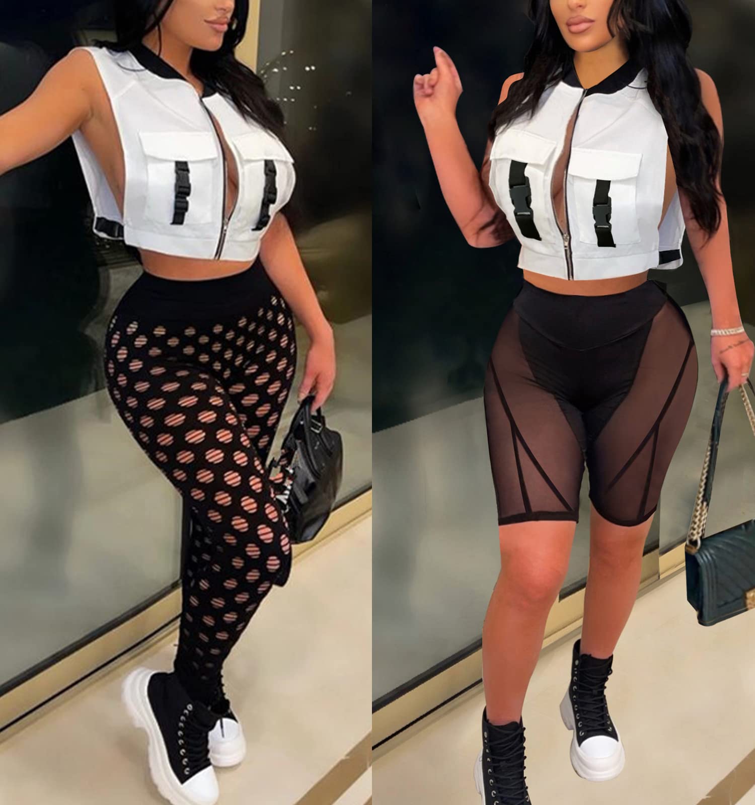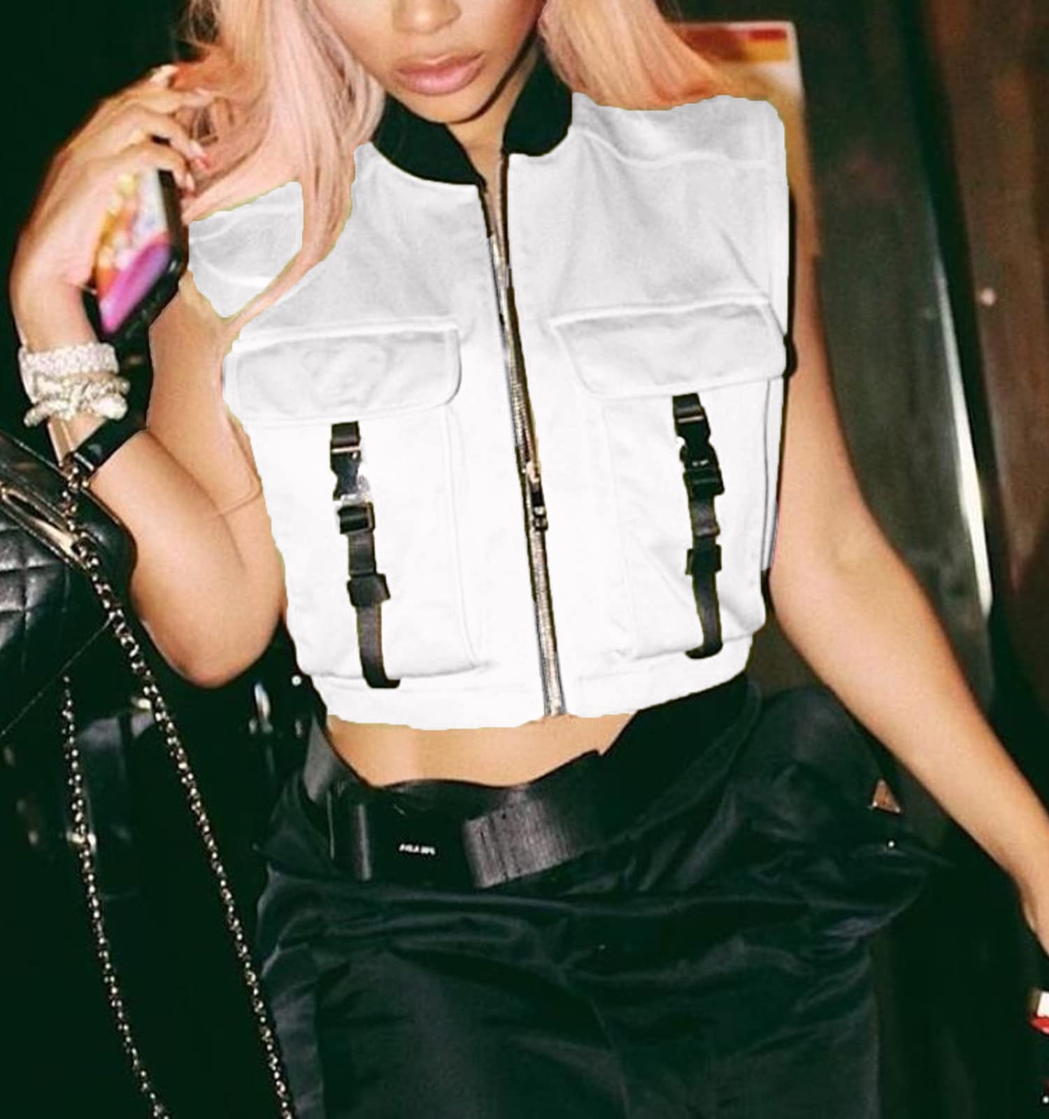 Features:The sexy sleeveless zip jacket is buckle and metal zip up closure, two flap chest pockets, bomber jacket collar, solid color, both two sides completely hollowed out with adjustable buckle make you look more sexy and fully show your feminine charm.