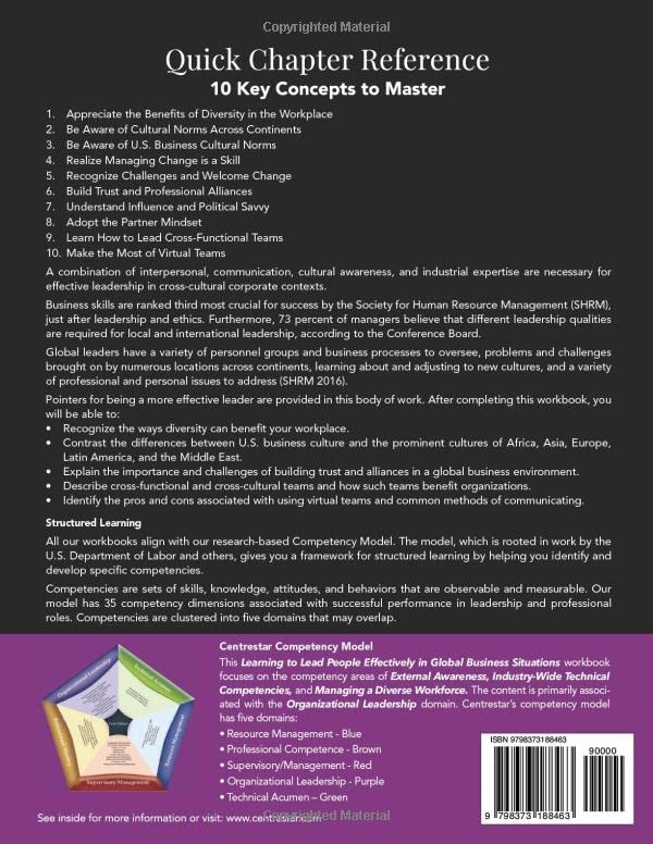 Winner - 2023 Global Book Awards: FINALIST / Business Leadership A combination of interpersonal, communication, cultural awareness, and industrial expertise are necessary for effective leadership in cross-cultural corporate contexts. Business skills are ranked third most crucial for success by the Society for Human Resource Management (SHRM), just after leadership and ethics. Furthermore, 73 percent of managers believe that different leadership qualities are required for local and international leadership, according to the Conference Board. Global leaders have a variety of personnel groups and business processes to oversee, problems and challenges brought on by numerous locations across continents, learning about and adjusting to new cultures, and a variety of professional and personal issues to address (SHRM 2016). Pointers for being a more effective leader are provided in this body of work. Areas of focus include improving interpersonal communication skills to reach people with various linguistic and cultural backgrounds, recognizing and accepting cultural differences, encouraging and creating productive cross-functional and cross-cultural team environments, and learning to lead multigenerational groups. After completing this workbook, you will be able to: Recognize the ways diversity can benefit your workplace. Contrast the differences between U.S. business culture and the prominent cultures of Africa, Asia, Europe, Latin America, and the Middle East. Explain the importance and challenges of building trust and alliances in a global business environment. Describe cross-functional and cross-cultural teams and how such teams benefit organizations. Identify the pros and cons associated with using virtual teams and common methods of communicating. 10 Key Concepts to Master Appreciate the Benefits of Diversity in the Workplace Be Aware of Cultural Norms Across Continents Be Aware of U.S. Business Cultural Norms Realize Managing Change is a Skill Recognize Challenges and Welcome Change Build Trust and Professional Alliances Understand Influence and Political Savvy Adopt the Partner Mindset Learn How to Lead Cross-Functional Teams Make the Most of Virtual Teams Structured Learning All our workbooks align with our research-based Competency Model. The model, which is rooted in work by the U.S. Department of Labor and others, gives you a framework for structured learning by helping you identify and develop specific competencies. Competencies are sets of skills, knowledge, attitudes, and behaviors that are observable and measurable. Our model has 35 competency dimensions associated with successful performance in leadership and professional roles. Competencies are clustered into five domains that may overlap. This Learning to Lead People Effectively in Global Business Situations workbook focuses on the competency areas of External Awareness, Industry-Wide Technical Competencies, and Managing a Diverse Workforce. The content is primarily associated with the Organizational Leadership competency cluster or domain. For more information or visit: www.centrestar.com Best of all? You can take any course: Online at your own pace through Centrestar and earn CEUs or PDHs: www.centrestar.com Select workbook materials through Amazon and conduct your own customized inhouse training Arrange to have any or all sessions instructor led via remote platform for your organization by the Pennsylvania College of Technology: call: 570.327.4775 or email: [email protected]