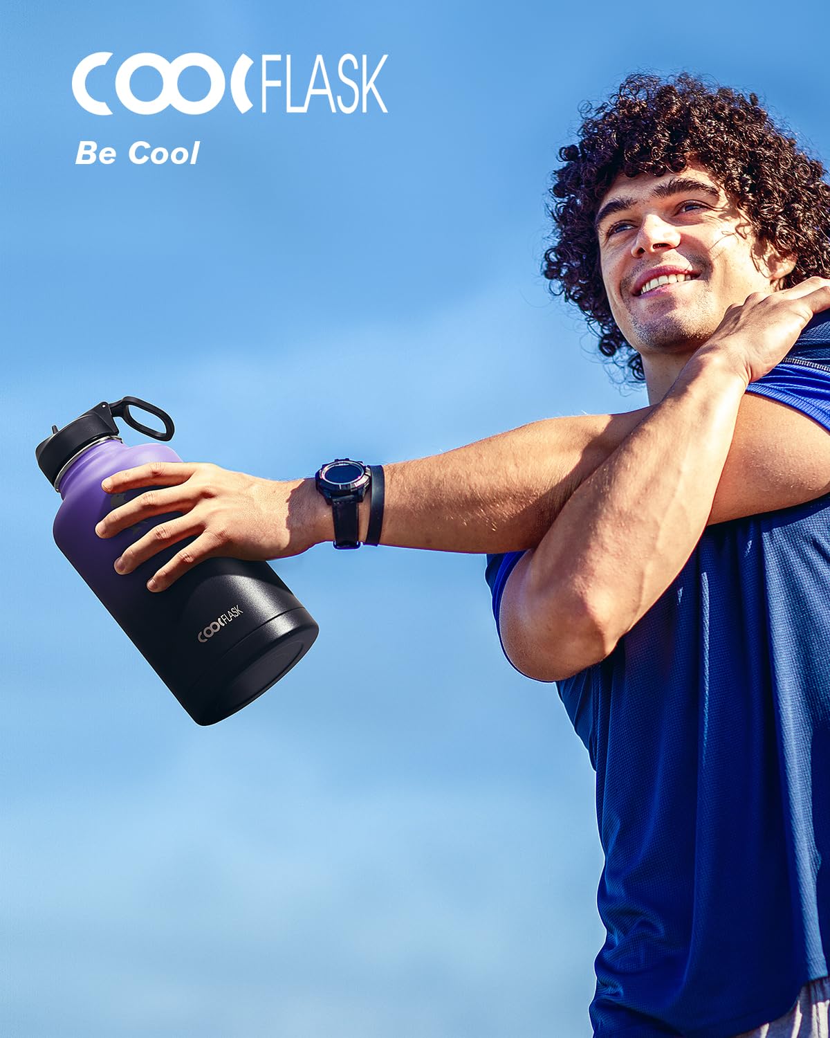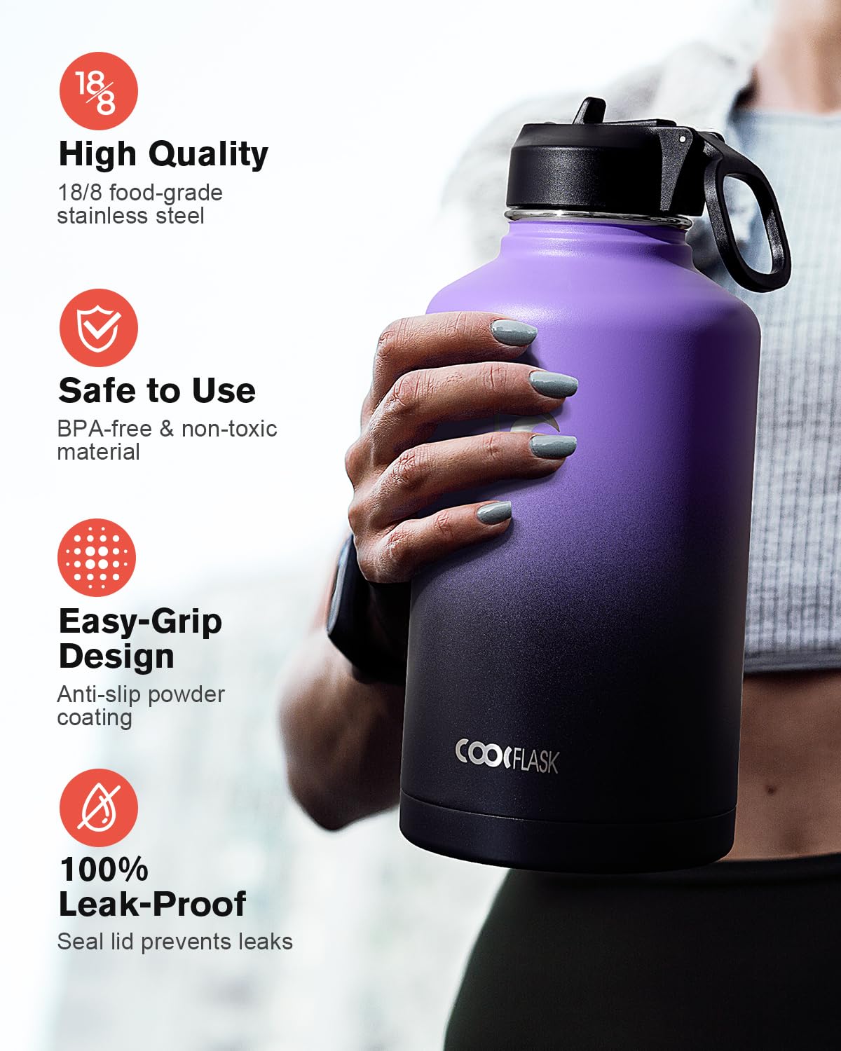 Coolflask Half Gallon Water Bottle Insulated with Straw & 3 Lids, 64 oz Water Jug Large Metal Stainless Steel Wide Mouth for Sports, Gym or Office, Non-BPA Keep Cold 48H Hot 24H, Purple Black