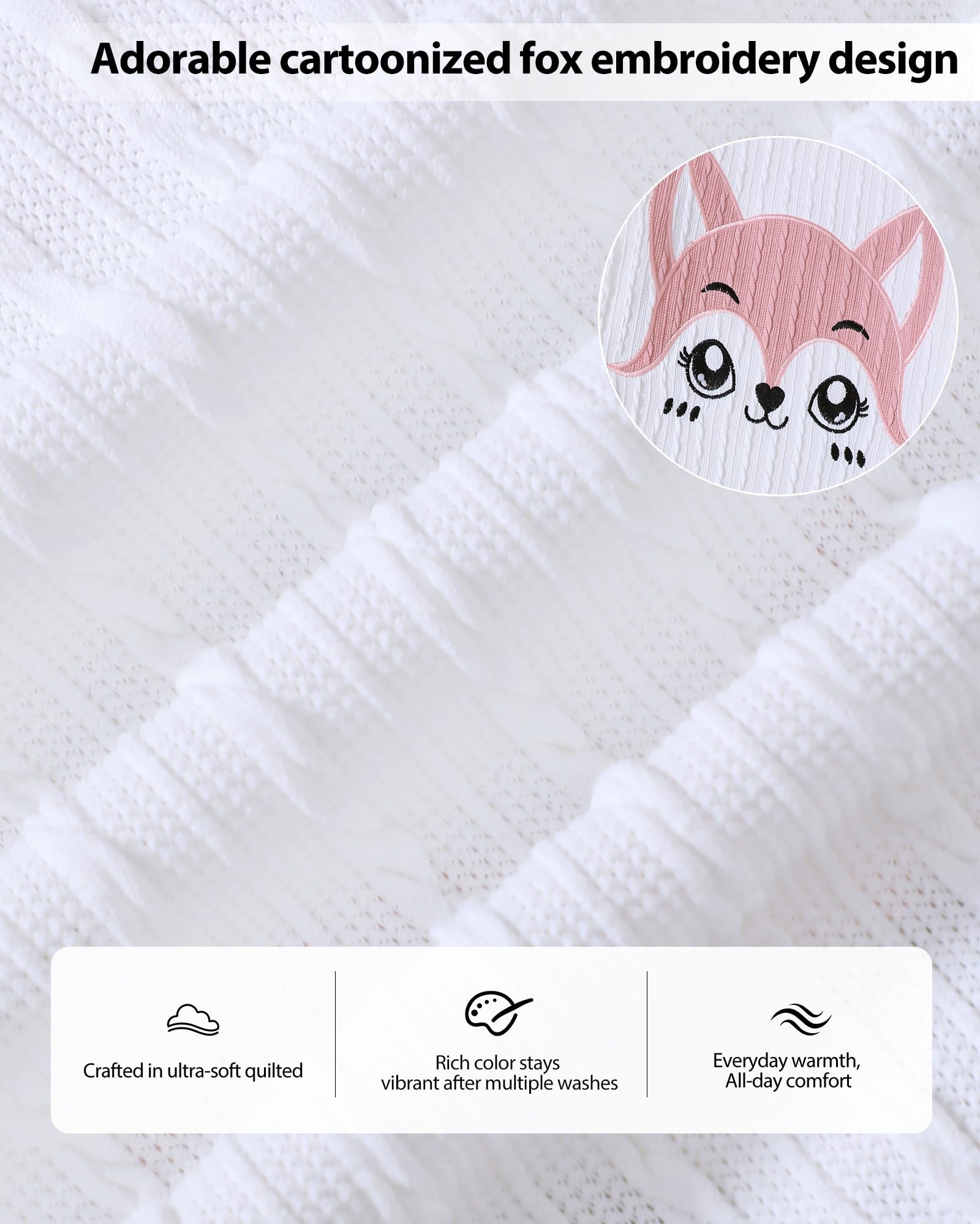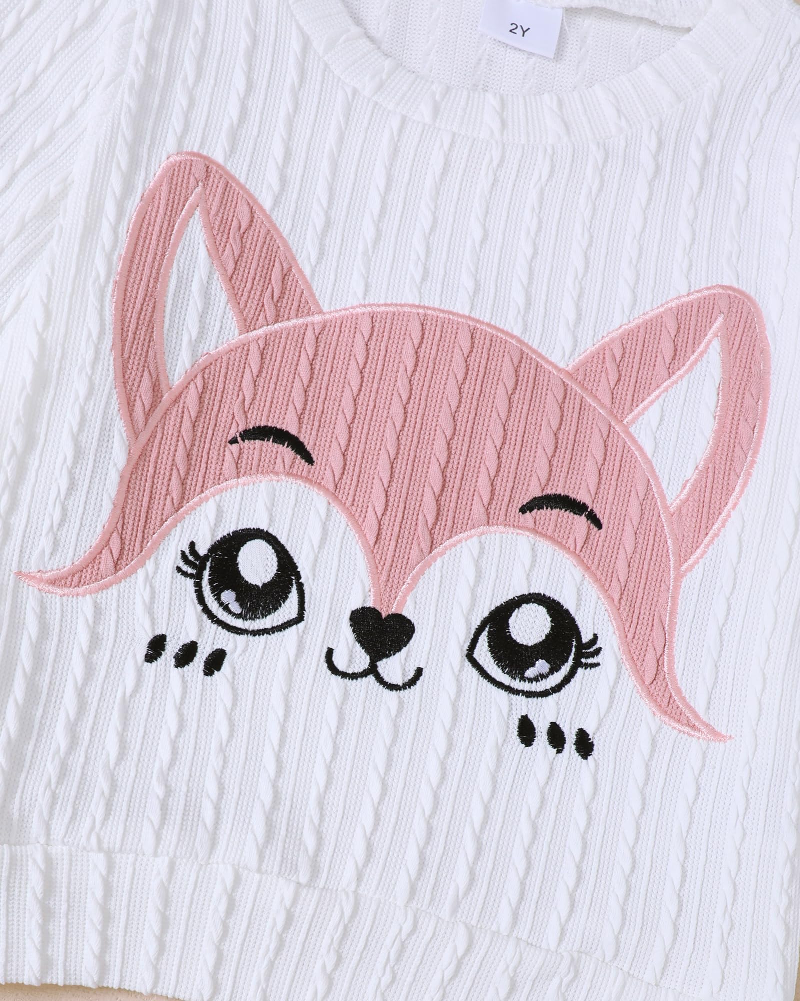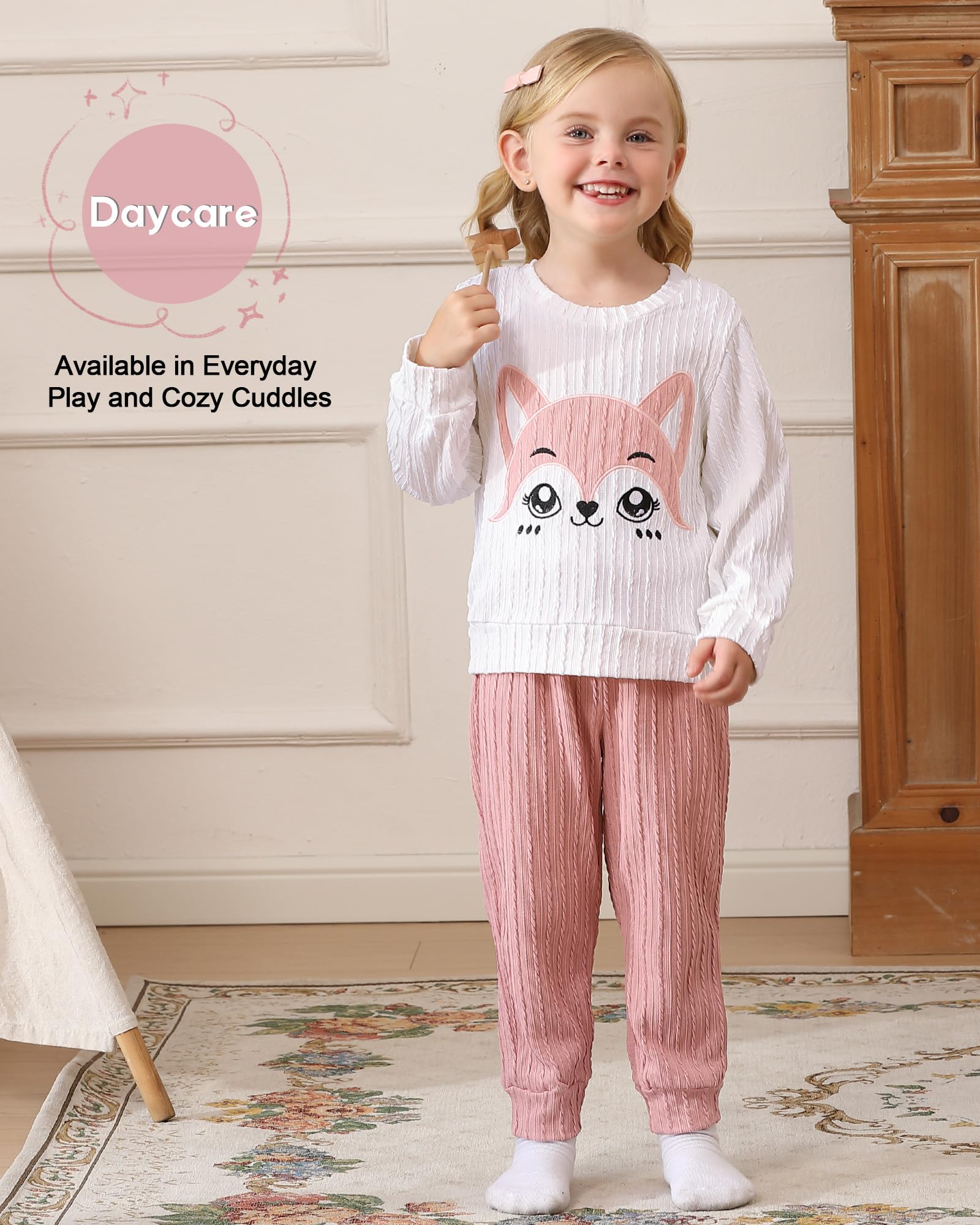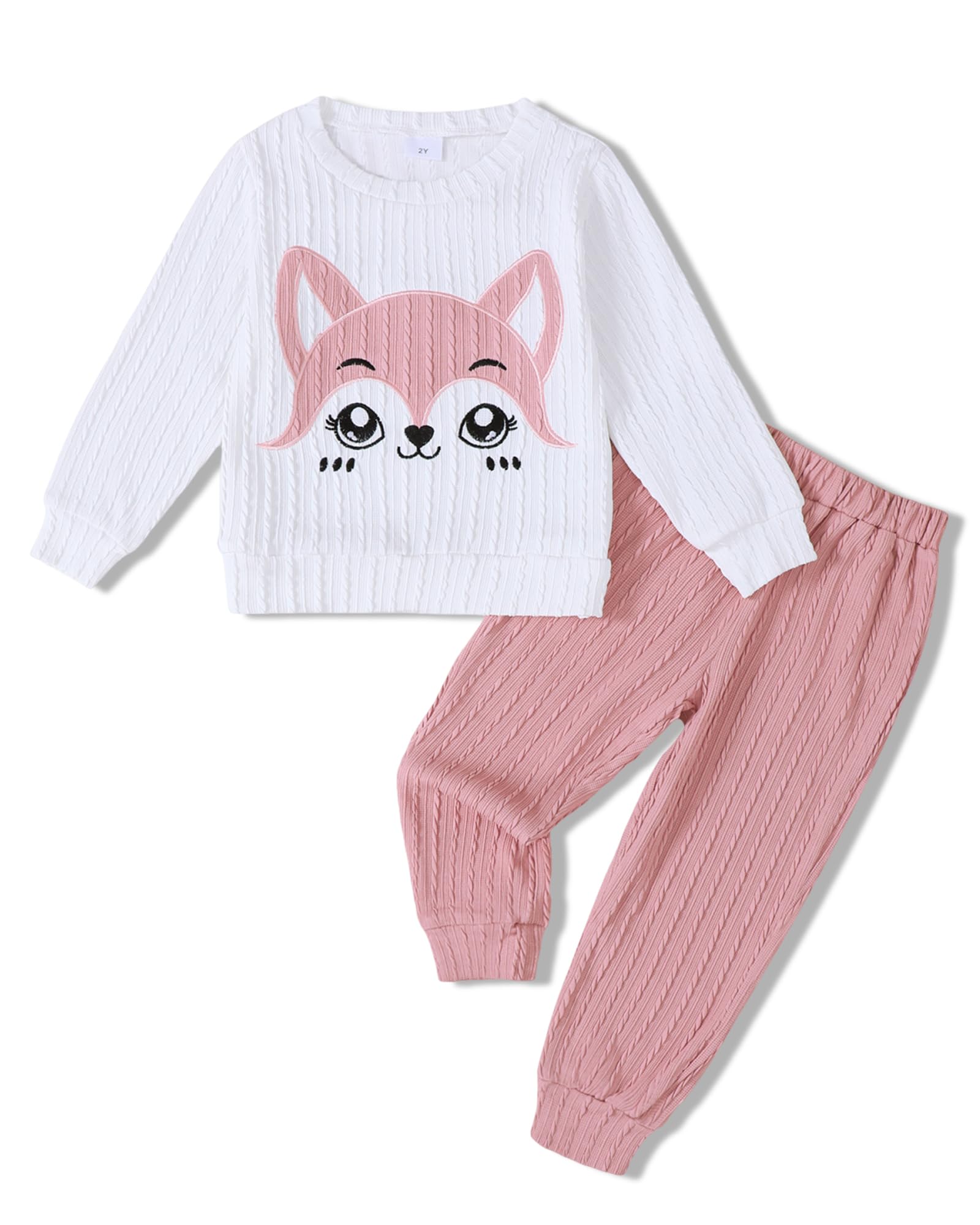 Kids girls clothing set with a cartoon fox embroidery pattern top and solid sweatpants—Gift your little girls a confident look, encourage their imagination—suitable for breezy fall and winter days.
