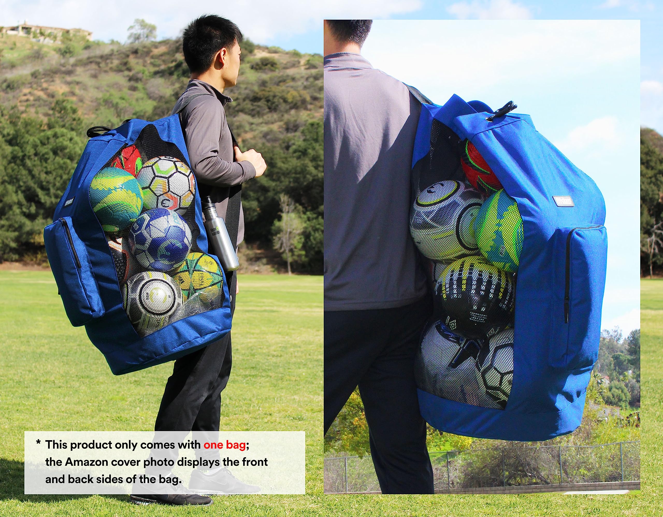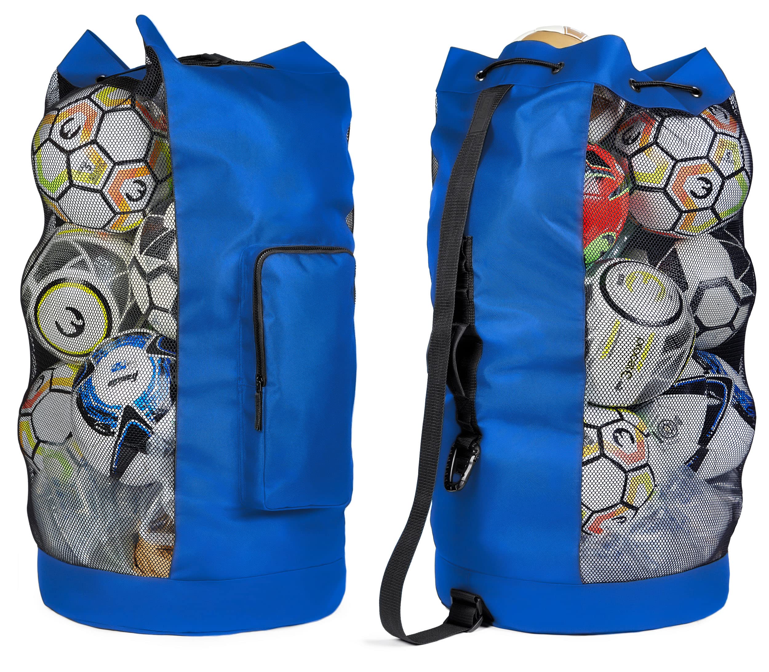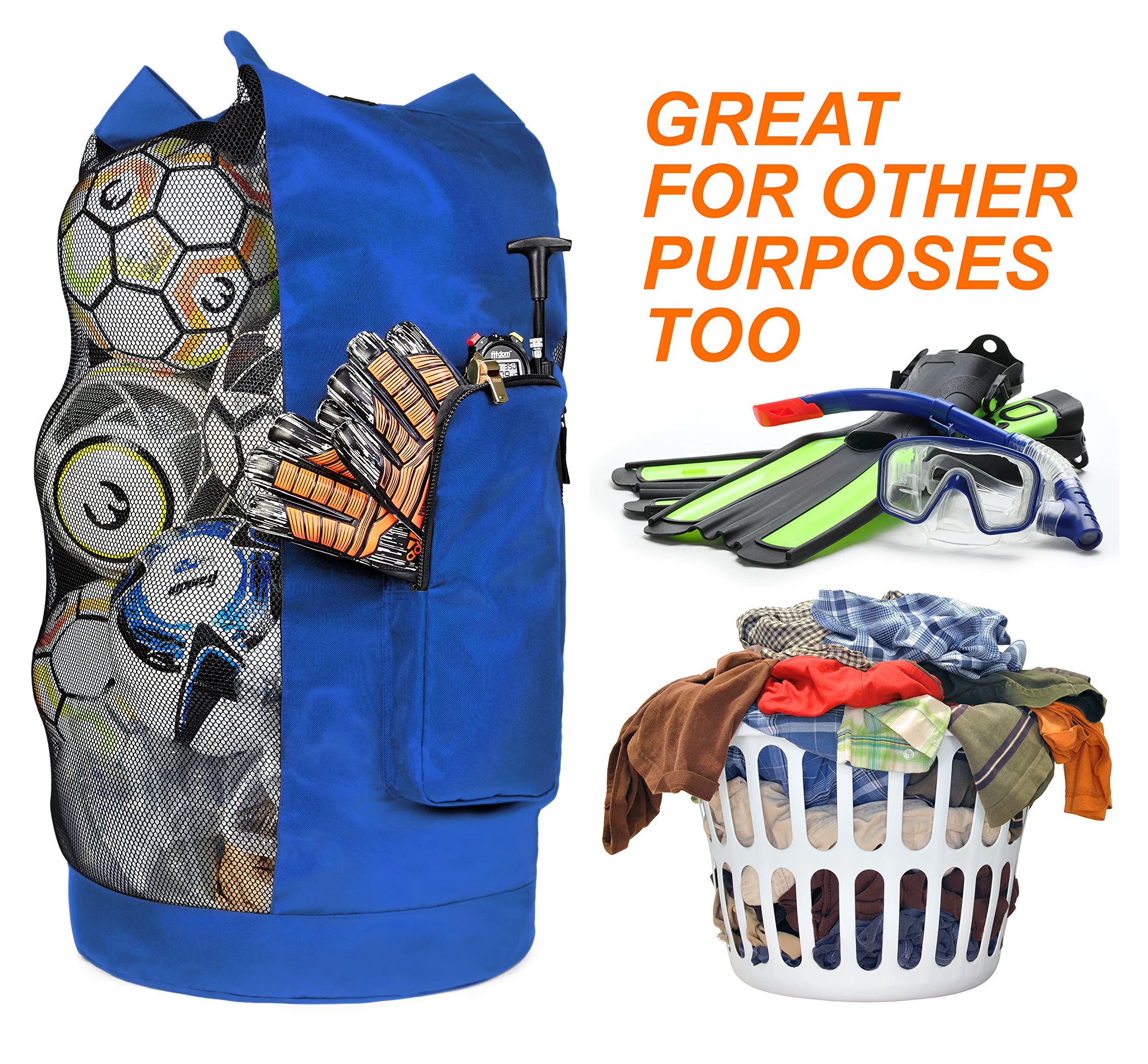 CARRY ALL YOUR BALLS AND EQUIPMENTS IN ONE BAG - Measuring at 17 inch wide and 36 inch tall, this EXTRA LARGE mesh bag can hold 13+ adult soccer balls, 10 basketball, and scuba gears for the whole family. Never have to worry about not bringing enough equipment because this bag will hold everything. The additional oversized SIDE POCKET is perfect for air pump, stopwatch, whistles and your personal item. It is the one equipment bag you will ever need for all your sports and outdoor events.