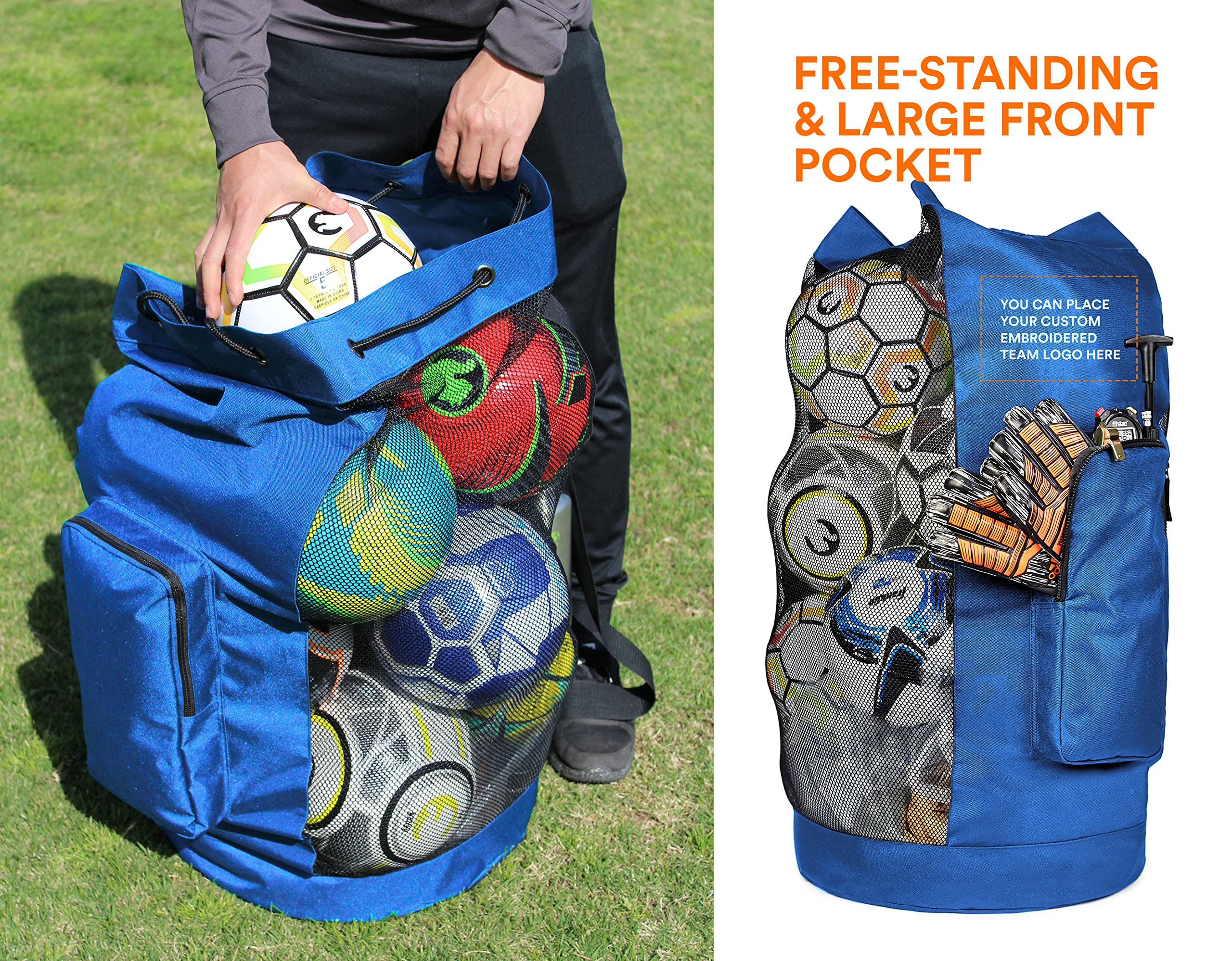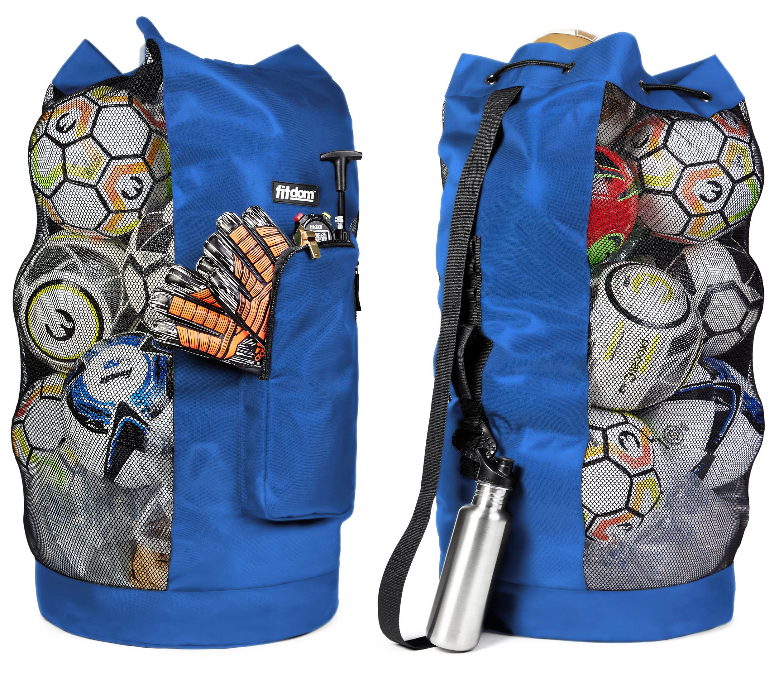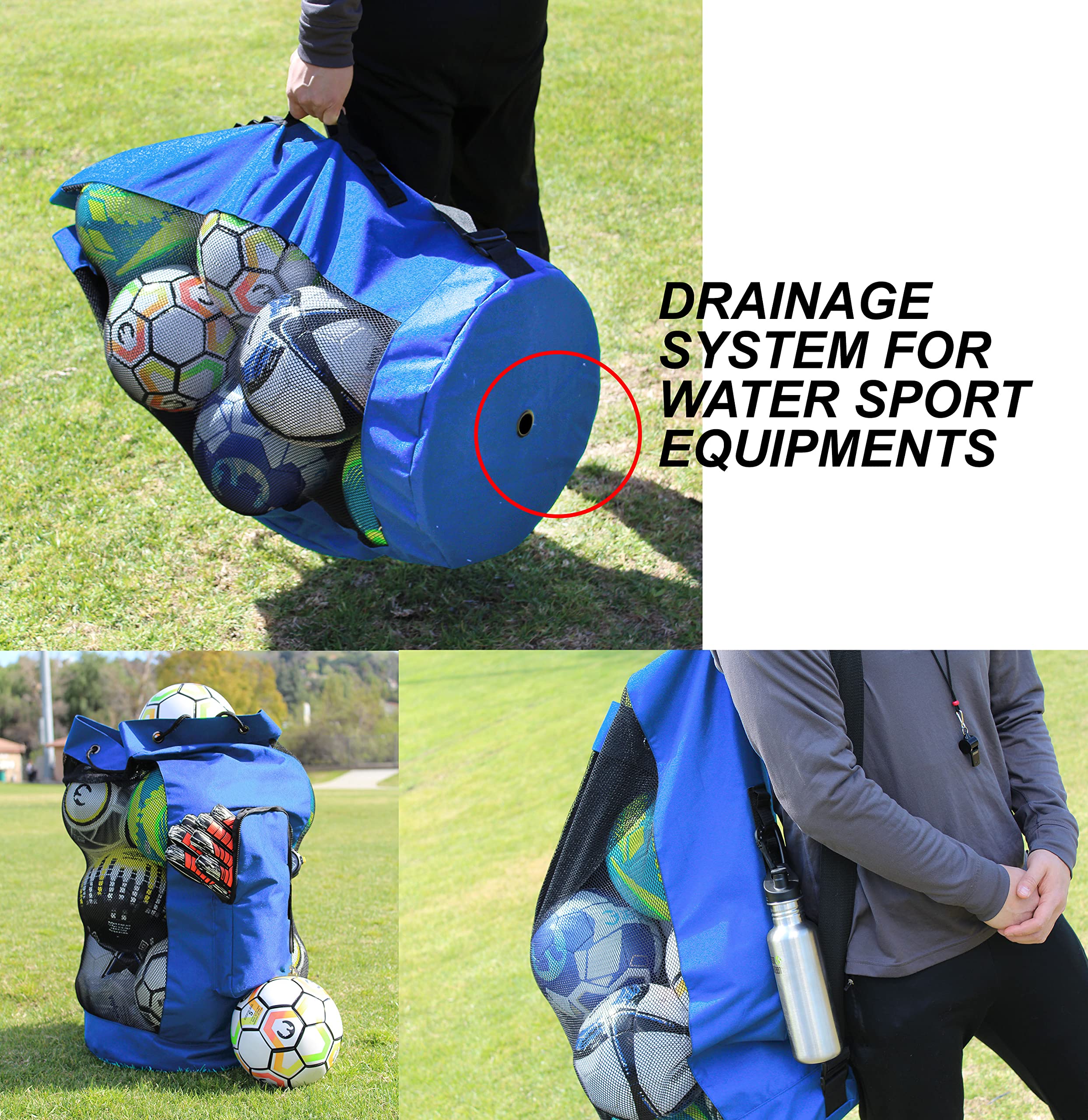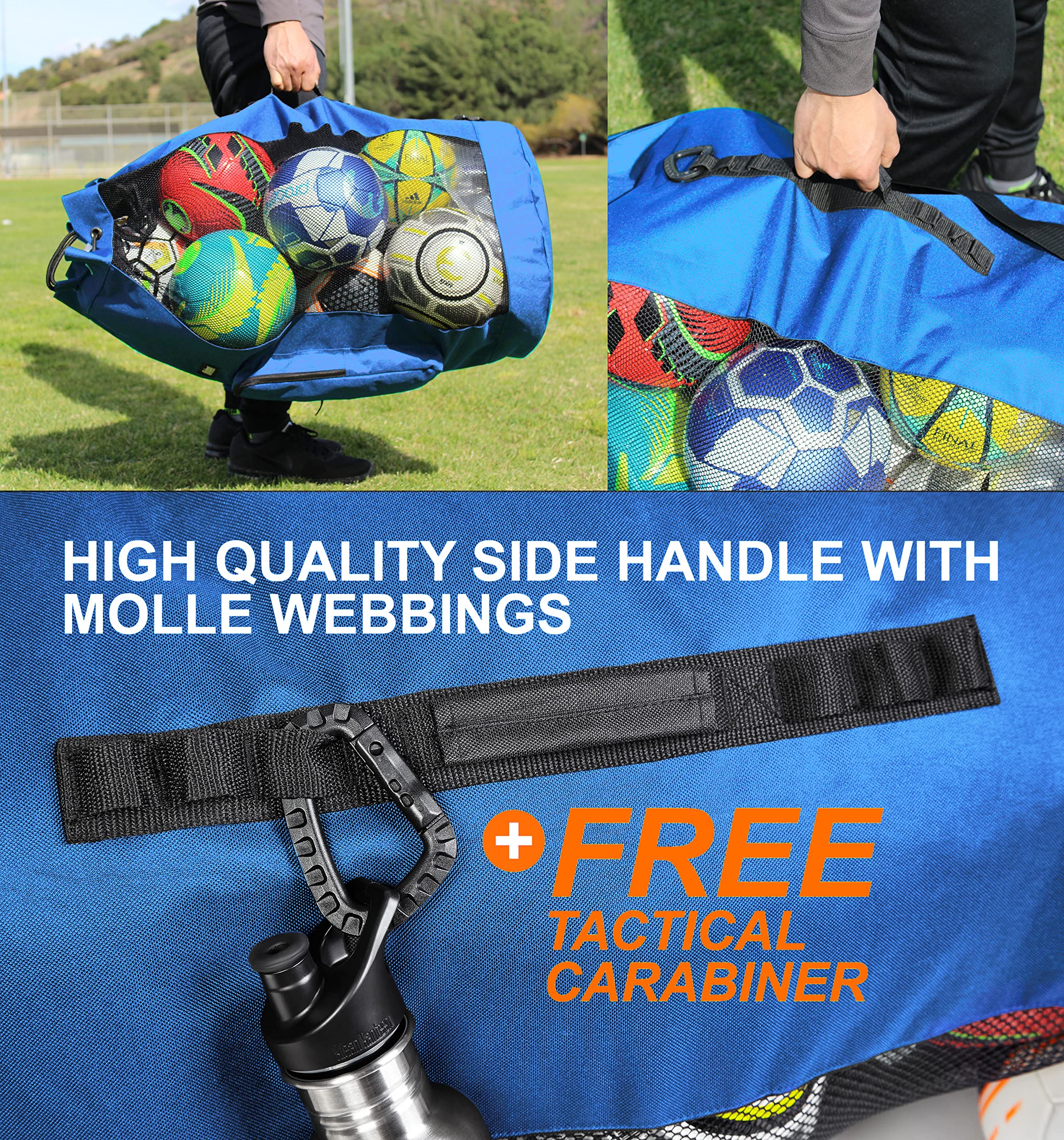 CARRY ALL YOUR BALLS AND EQUIPMENTS IN ONE BAG - Measuring at 17 inch wide and 36 inch tall, this EXTRA LARGE mesh bag can hold 13+ adult soccer balls, 10 basketball, and scuba gears for the whole family. Never have to worry about not bringing enough equipment because this bag will hold everything. The additional oversized SIDE POCKET is perfect for air pump, stopwatch, whistles and your personal item. It is the one equipment bag you will ever need for all your sports and outdoor events.