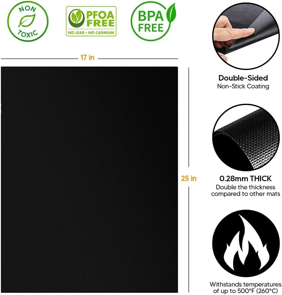 PREMIUM QUALITY & SUPERIOR DURABILITY: One large black oven liner (17" x 25"), made from extra-thick 0.28mm heavy duty non stick material, thicker and more durable than standard liners on the market. Built to withstand high heat up to 500°F without warping or damage, providing long-lasting protection for the bottom of ovens. Easily trimmed for a perfect custom fit, these liners are a better, more reliable alternative to aluminum foil and sheets.