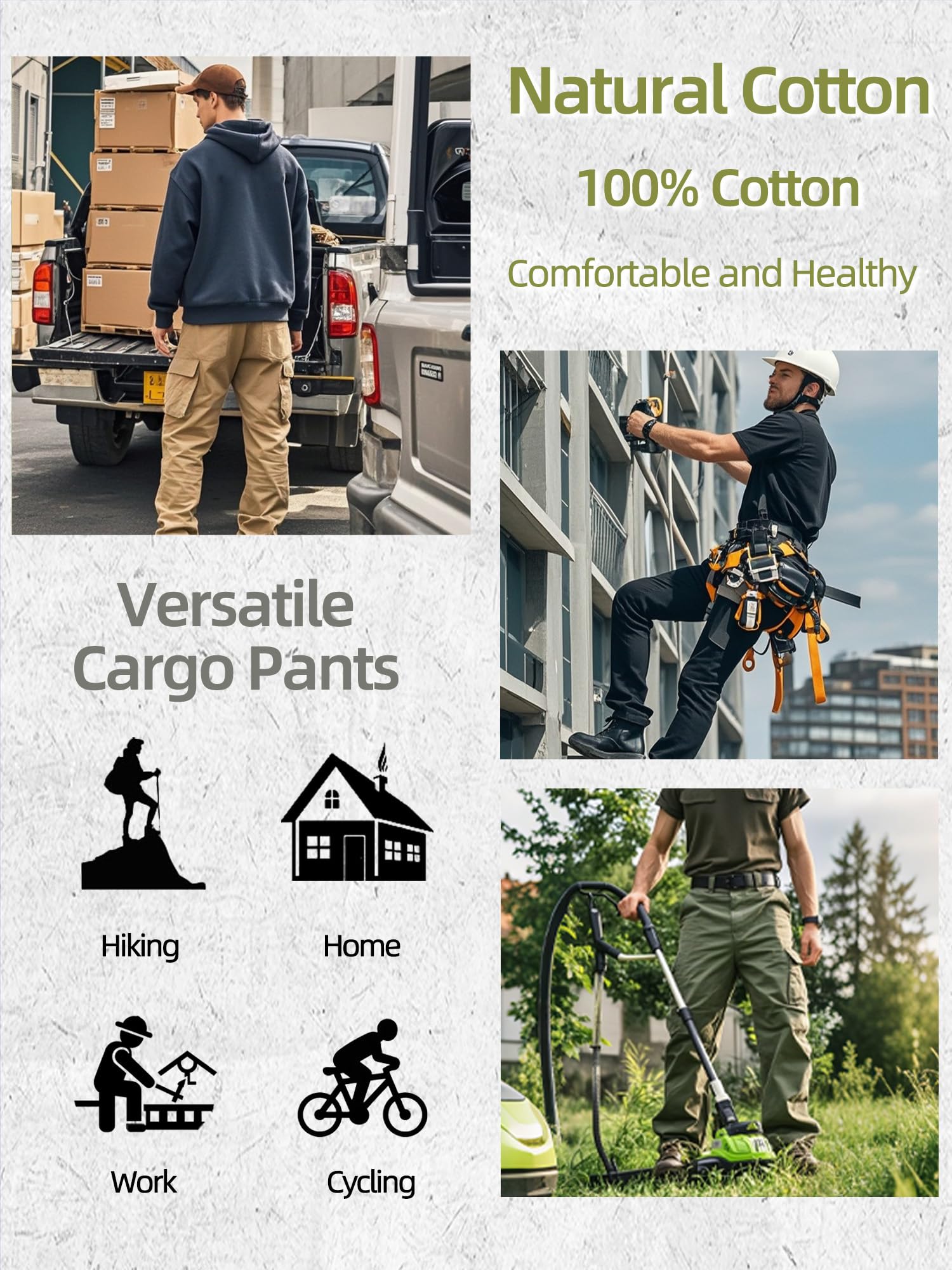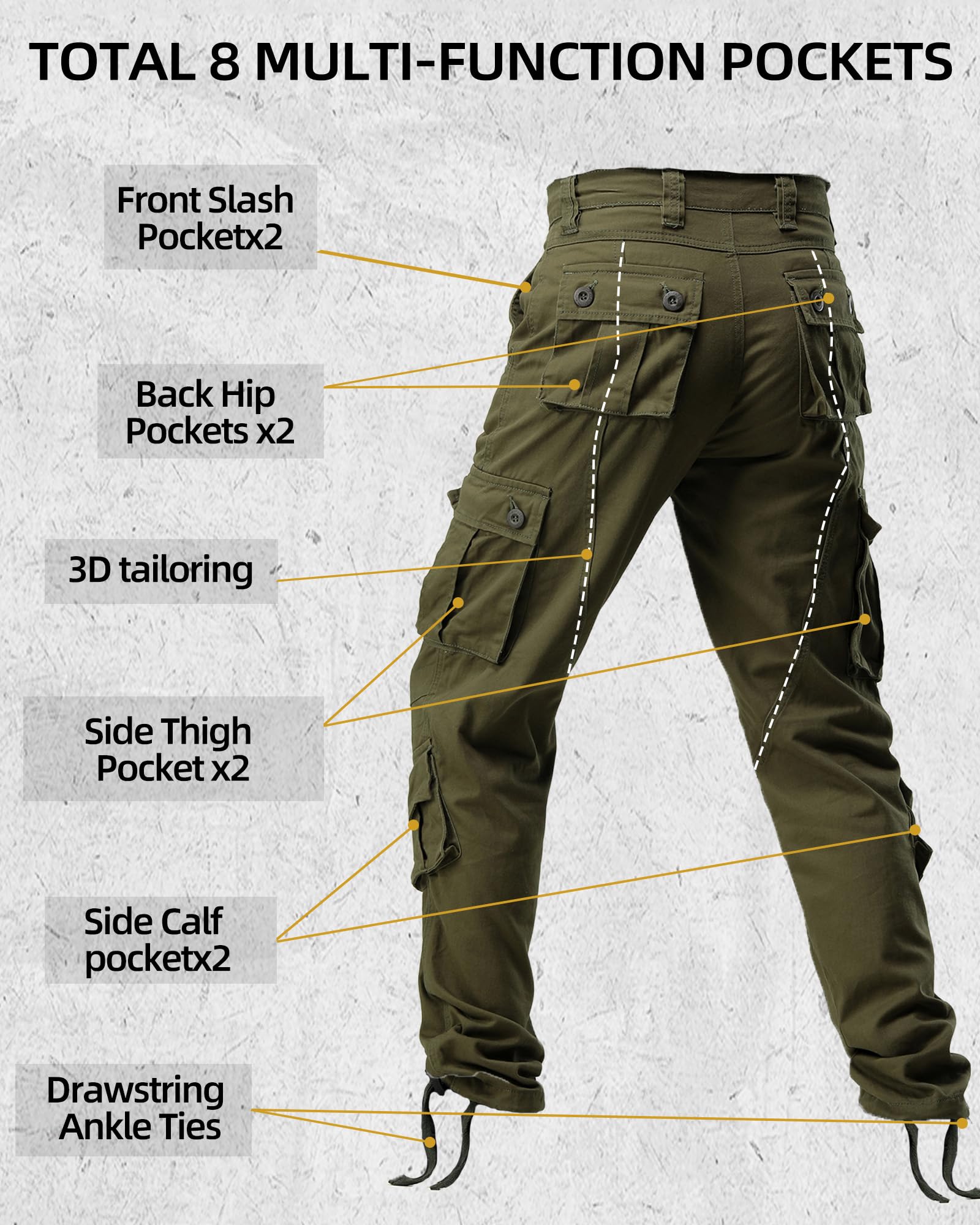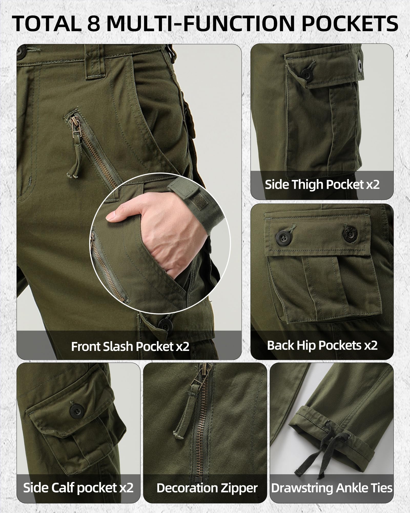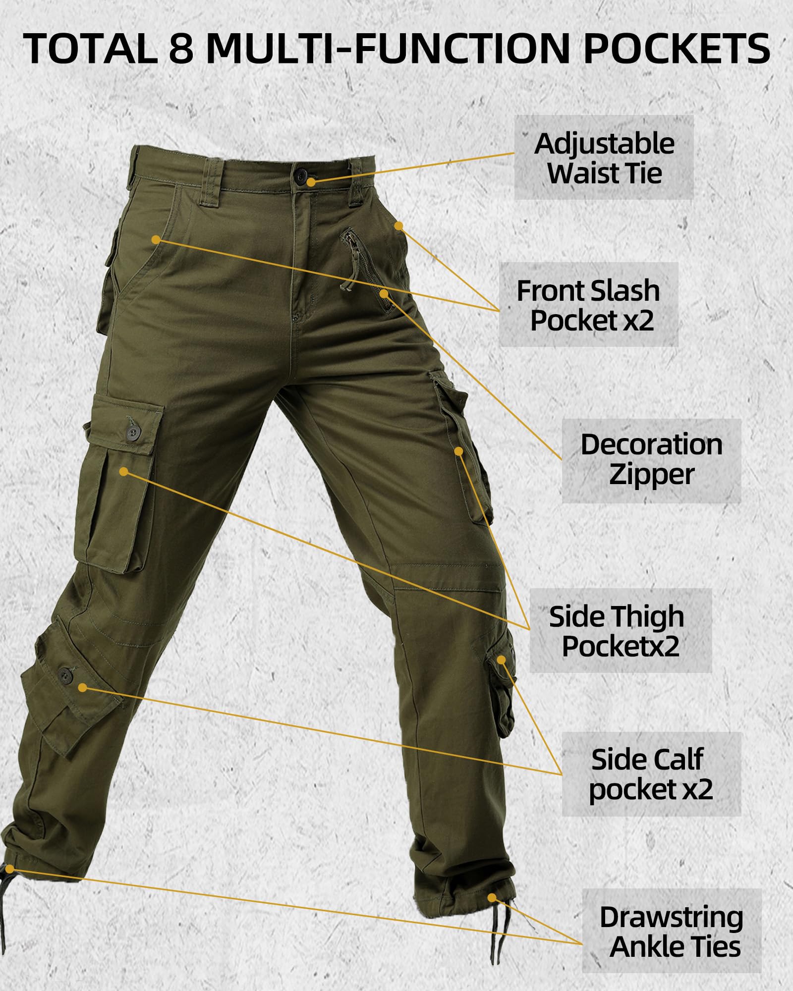 Product Material: Solid and camo cargo pants for men use 100% cotton fabric, treated for ease of care with a wrinkle-resistant finish and durability,it features non-slip, durable, comfortable, abrasion-resistant soft,breathable and sweat-absorbent,can repel the stains, liquids and soil keep you all day dry and clean.Relaxed fit military pants with zipper closure and straight leg,drawstring tie inside the ankle and the waist for comfort fit.