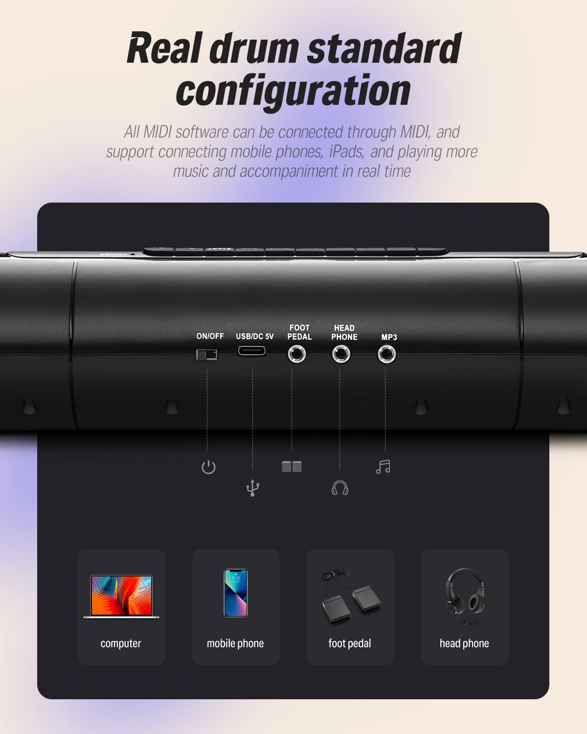 [MIDI Connect & Gameplay] Come with standard midi out jack and USB midi out jack, you can connect the drum to computers to produce music or play games, or connect external speakers for family entertainment/birthday parties. Perfect for adults who need MIDI functionality and children for entertainment.