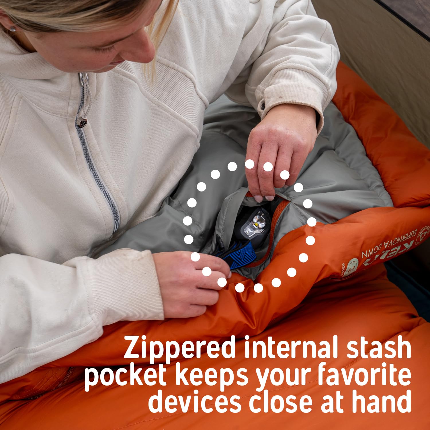 SLEEP LIKE A STAR Halfway between the backyard campout and the backcountry adventure, you’ll find our Supernova down sleeping bag—offering all the compact, lightweight warmth of our popular Cosmic bag, in a roomy shape that accommodates a wider range of body types and sleeping positions! Lofty baffles and buttery-soft fabric keep you cozy and comfy on colder nights, while an anti-snag zipper design with locking sliders enables you to let off steam when things get heated. And then it all packs down small (and fast) into the included stuff sack.