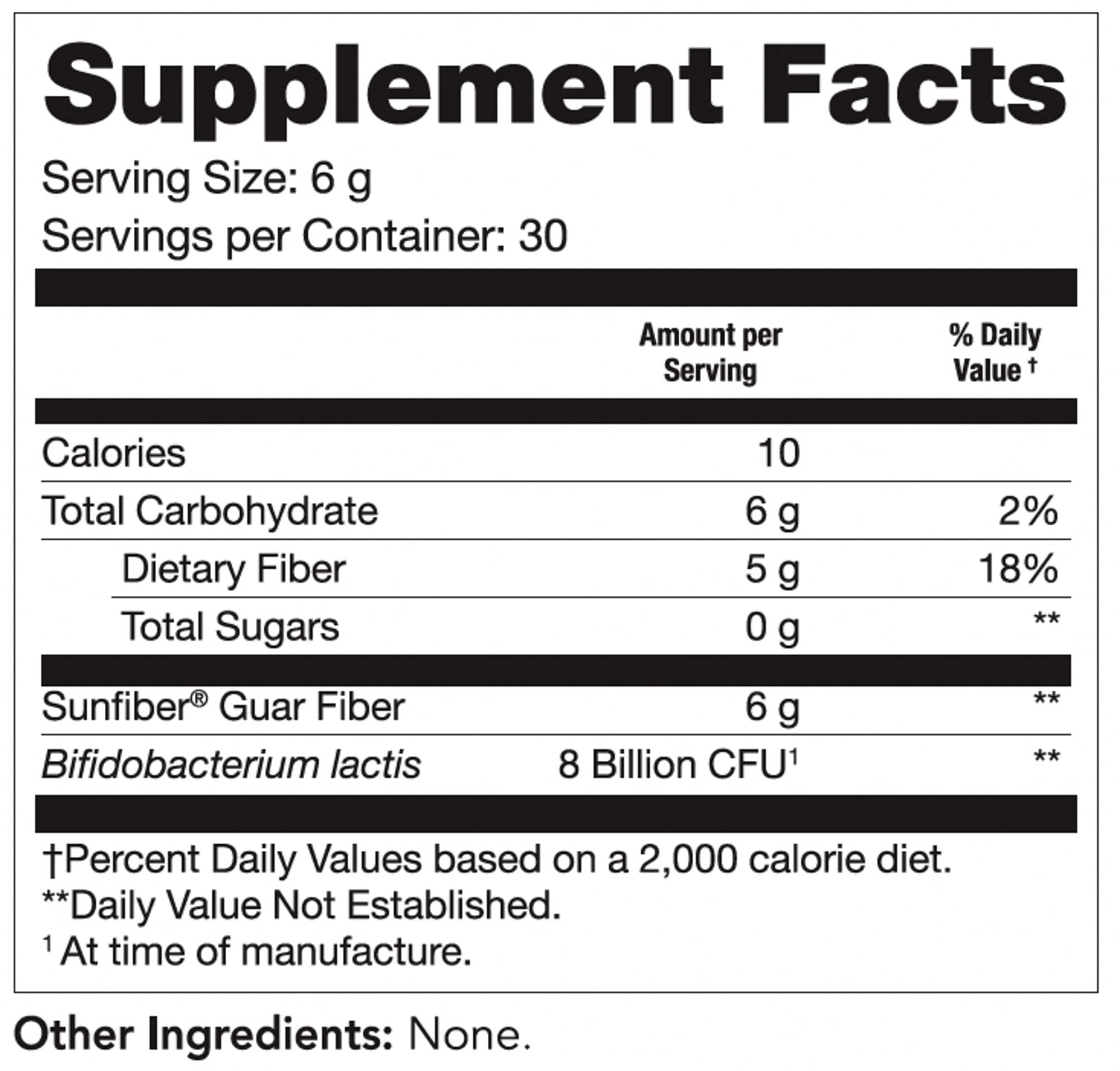 Sunfiber GI combines the benefits of Sunfiber with probiotics like Bifidobacterium lactis. Each serving provides 5g of prebiotic fiber & 8 billion probiotics. A true regulating prebiotic fiber made from guar plant, Sunfiber also known as guar fiber or Partially Hydrolyzed Guar Gum (PHGG), helps support both occasional constipation and occasional diarrhea. The probiotics work in harmony with the prebiotic Sunfiber fiber to nourish beneficial gut bacteria, promoting a healthier digestive system and improved gut function. Some prebiotics rapidly ferment in the gut, causing uncomfortable bloating and gas. But, not Sunfiber! The fermentation process of Sunfiber is extremely slow, leading to significantly less gas, bloating and discomfort. Plus, Sunfiber is the first Low FODMAP certified prebiotic fiber, which makes it suitable for those with digestive issues and sensitive systems. This easy-to-use powder dissolves fast and clear, allowing you to enjoy all the benefits of a fiber supplement without changing the taste and consistency of your favorite foods and beverages. Mix with your favorite recipes, drinks, smoothies, cereals and more to boost your fiber intake. Sunfiber is backed by more than 100 clinical studies for digestive health, gut health, glycemic control and satiety. This product is gluten-free, 100% natural, low calorie, vegetarian, Glyphosate Residue Free Certified & non-GMO project verified.* *These statements have not been evaluated by the Food and Drug Administration. This product is not intended to diagnose, treat, cure, or prevent any disease.