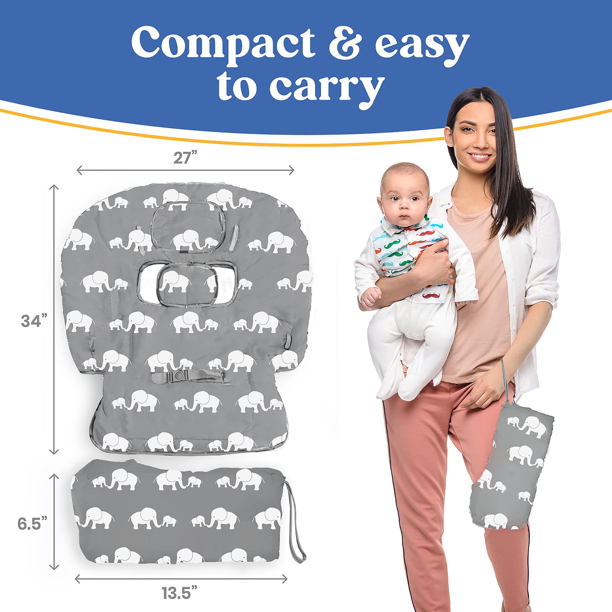 🛒Made for You & Your Baby's Convenience: With 2 adorable designs to choose from, it’s ideal for boys and girls. Our seat cover is designed w/ 2 snack pockets, a bottle/cup holder with strap, smartphone pocket that fits most phone sizes, 2 toy loops for hanging toys & a large pocket for extra baby essentials. It's compact & easy to install & carry, measuring 6.5" x 13.5" when folded & 31.5" x 40" when fully opened. It's spacious but still travel-friendly & can be folded into a lightweight pillow