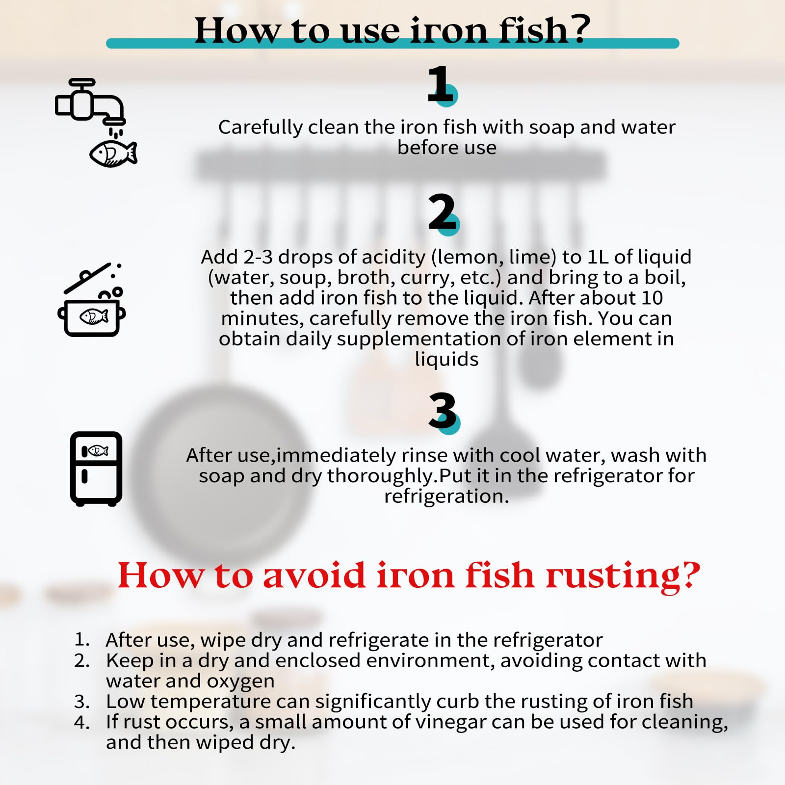 Attention to use: After using the iron fish, wash it by hand with water and soap, dry it and refrigerate it. It is not recommended to use a dishwasher for cleaning. If it rusts, simply dissolve it in vinegar and continue to use