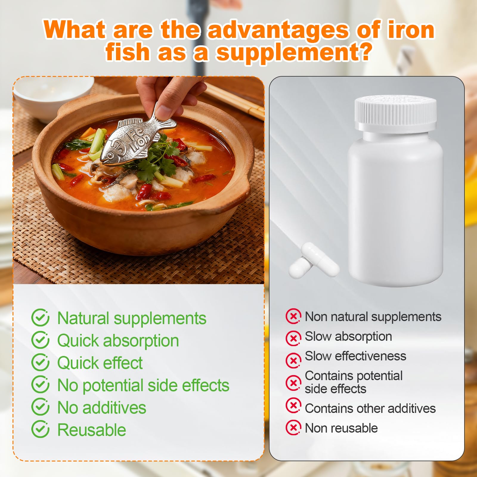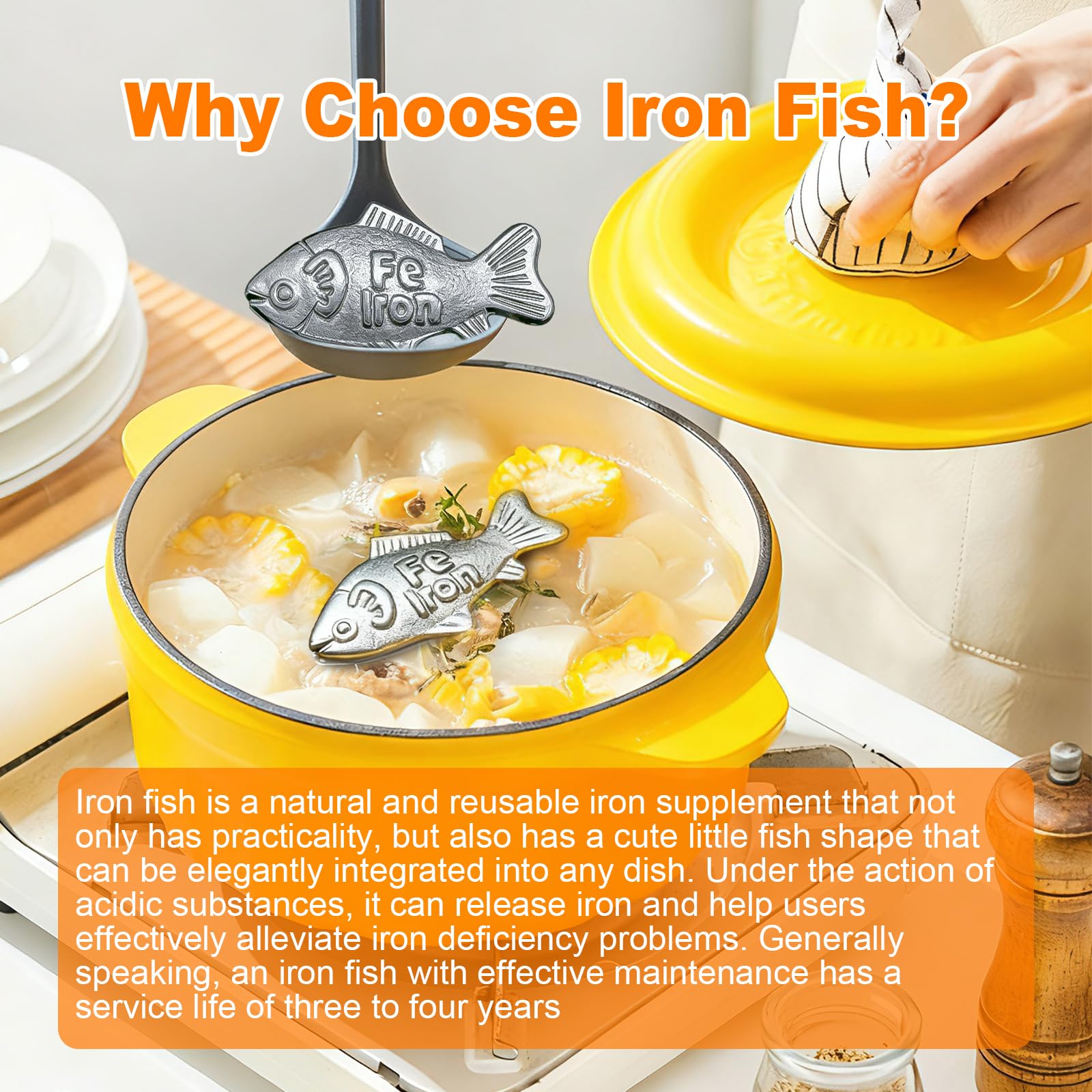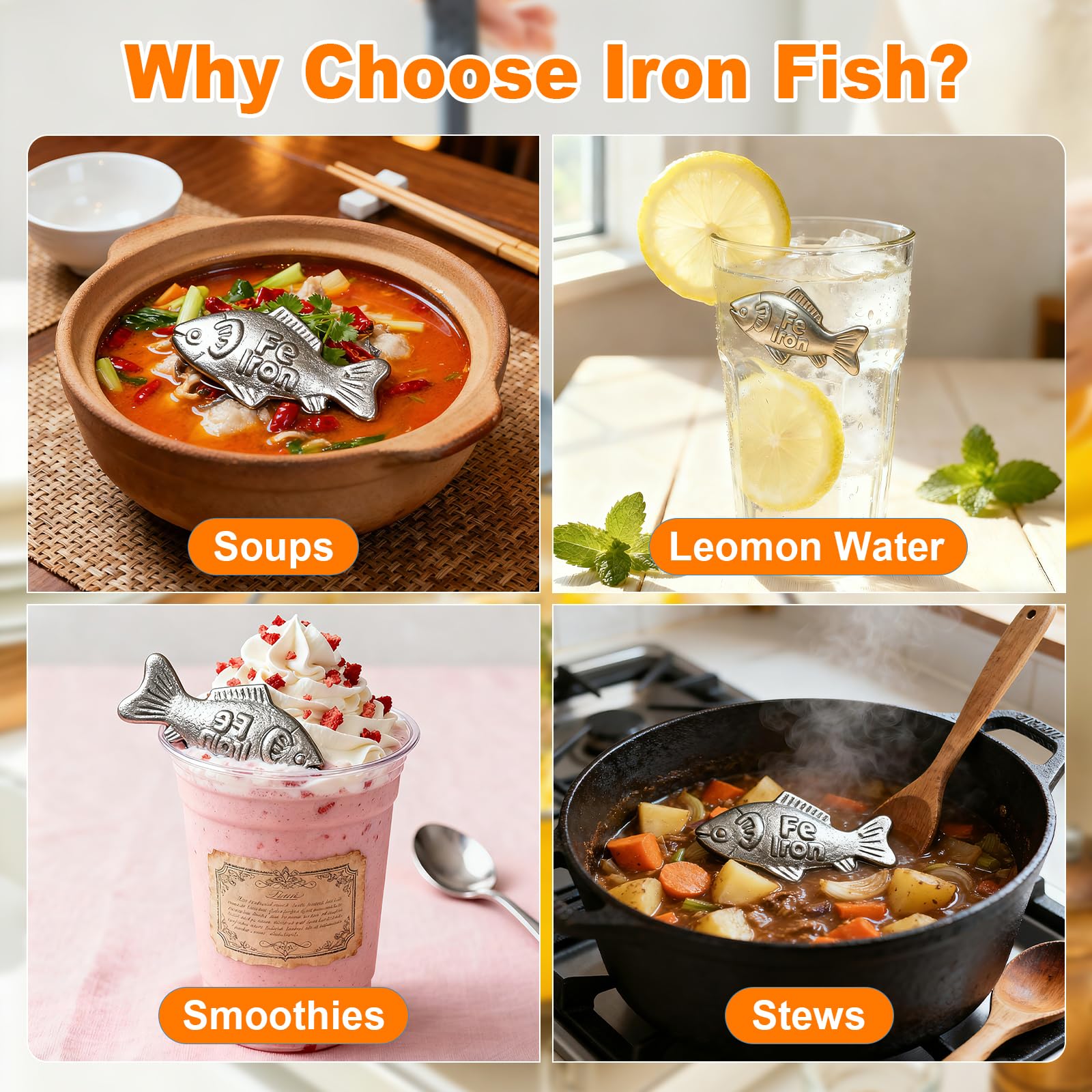 Natural iron Source: Crafted from high-purity iron, the Iron Fish gently releases natural iron when boiling soups, porridge, or other water-based foods. It's a direct dietary method designed to help you effortlessly supplement iron through daily cooking