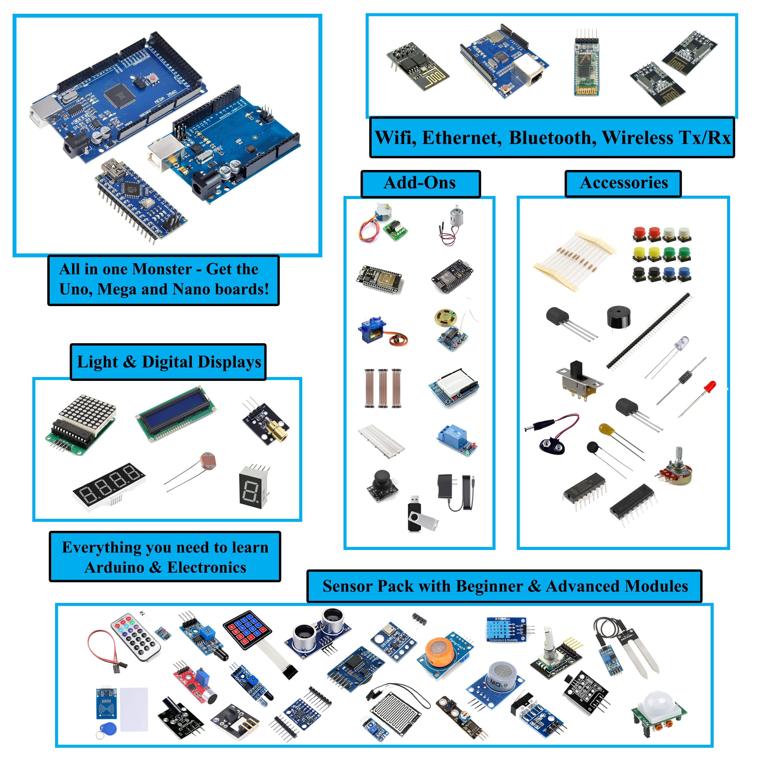 Advancing the development of robotics technology w/ Earth's 2nd biggest & most advanced starter kit for Arduino. 65+ pieces w/ FIVE main boards: 100% Arduino-compatible Uno R3, Mega 2560, Nano V3, ESP32 WiFi+Bluetooth and ESP8266 NodeMCU development platforms