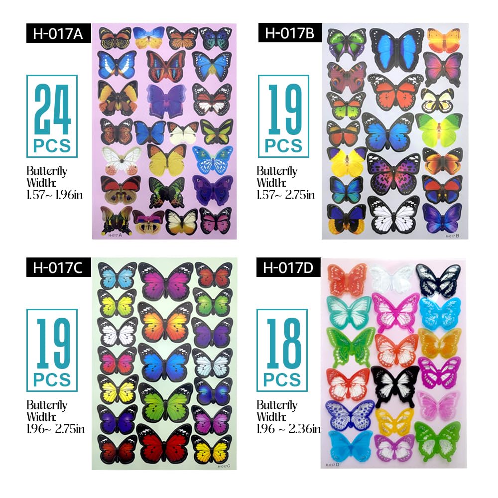 Beautiful butterfly stickers set: 80 pieces mixed butterflies, 4 styles(style A-24pcs, style B-19pcs, style C-19pcs, style D-18pcs). Include enough adhesive.Butterflies range in size from 1.57 inches (minimum)to 2.75 inches(maximum).