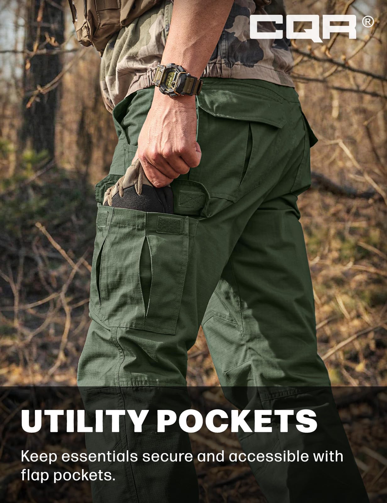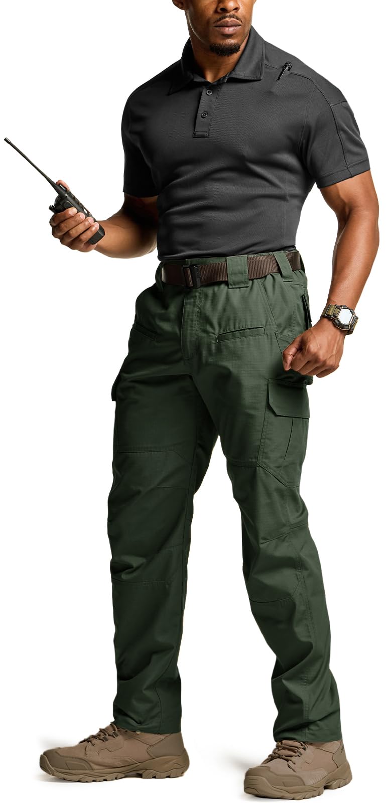 Description CQR Men's Tactical Pants Series Suitable for tactical, combat, military training, fishing, climbing, hiking, motorcycling, and outdoor activities *** Exclusive Tactical Belt is NOT included *** Materials Mix of Polyester & Cotton (Ripstop Fabric) is breathable, wrinkle-free, comfortable Duratex Ripstop Fabric Ripstop fabric has excellent durability and has water-resistant and stain-resistant Elastic Waistband Side waistband is to make a secure fit and support the active movement Tactical Layout Multi-purpose cargo pockets allow carrying various tools and equipment without having to hold them in your hands Button and Zipper Closure High-strength and high-density the Metal Alloy Button and Zipper along with a durable mounted stopper