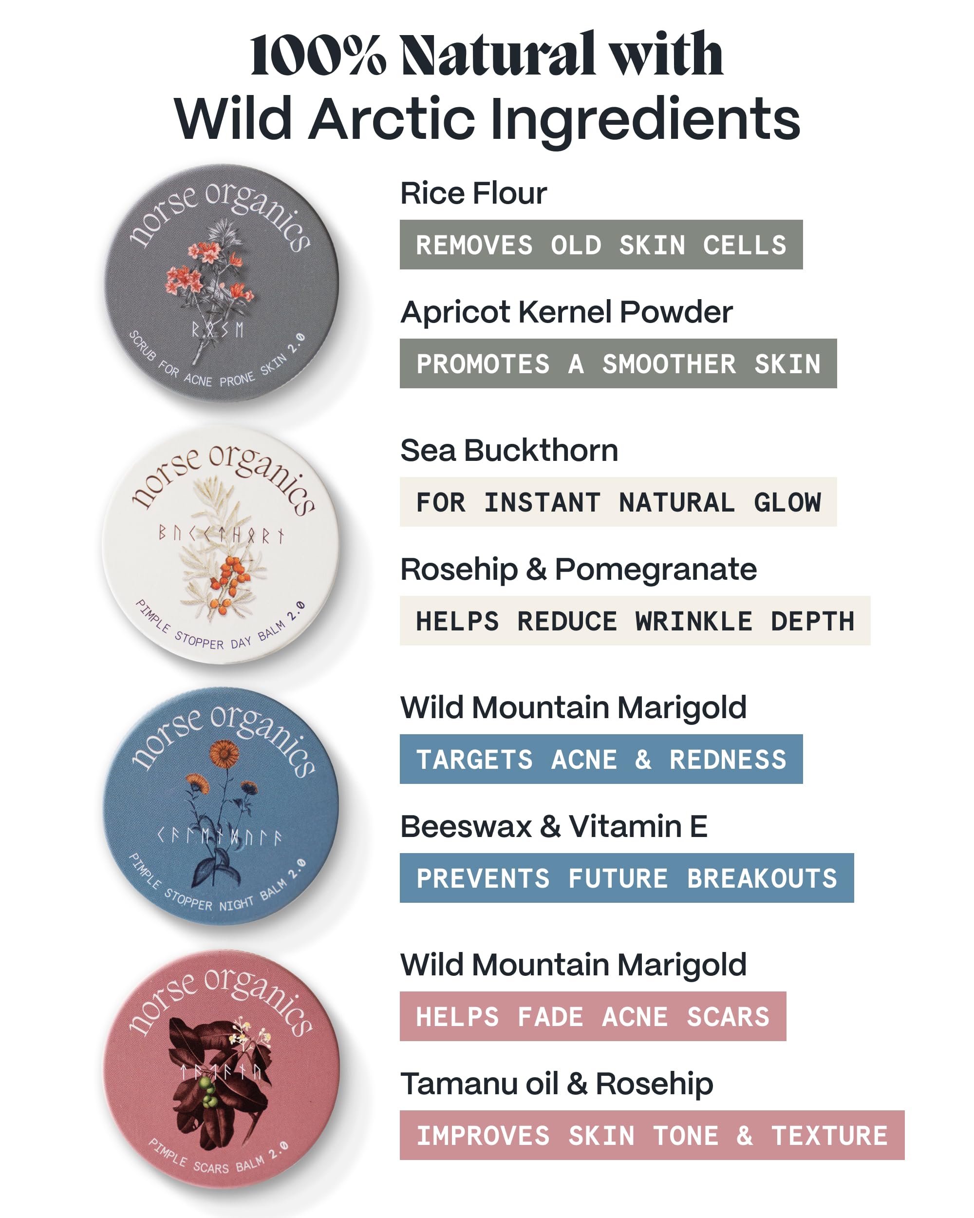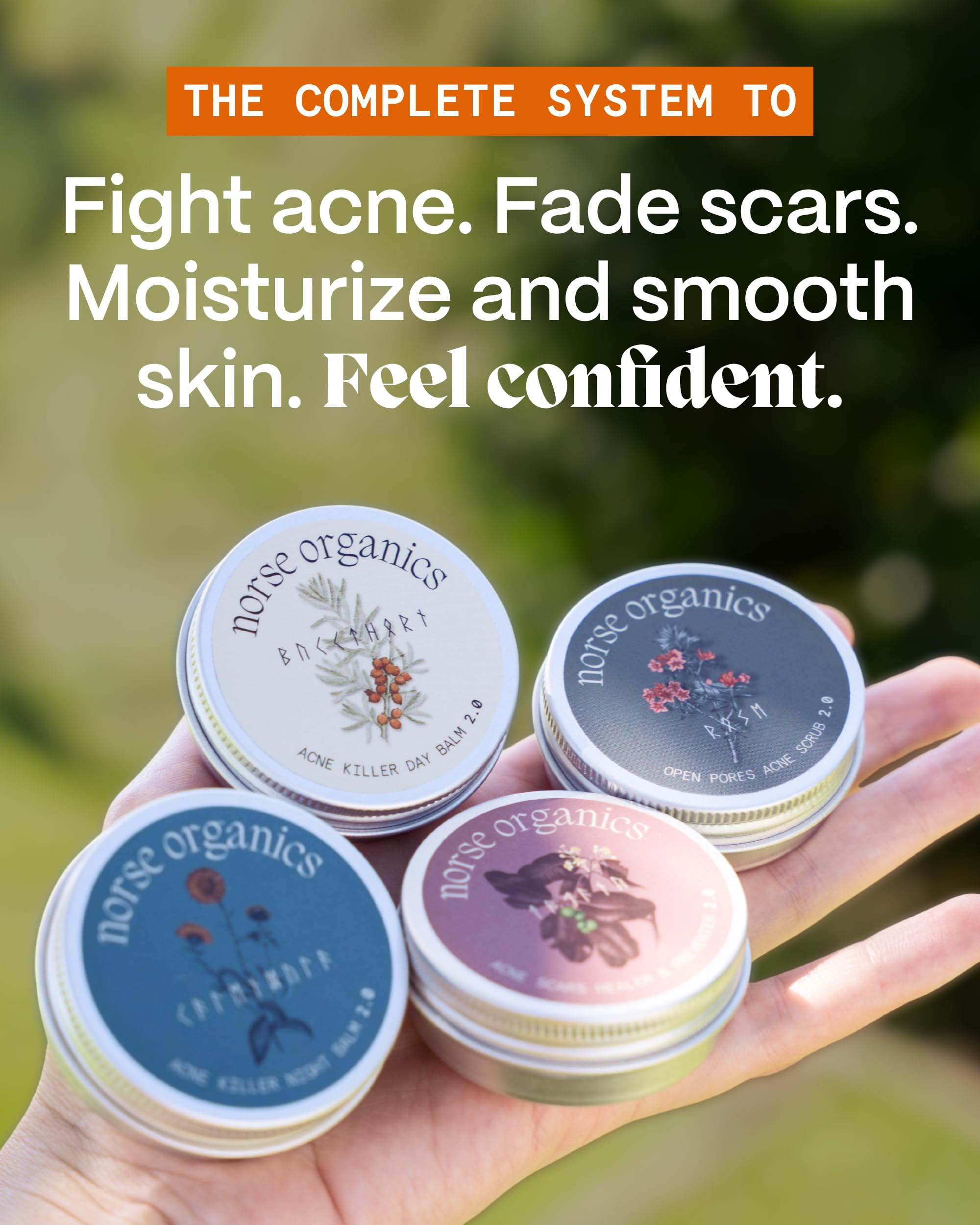 COMPLETE 4 STEP ACNE SYSTEM FOR FAST RESULTS. This kit includes Day Balm, Night Balm, Acne Scars Healer, and Pore Scrub, all based on Ancient Viking recipes with Arctic herbs and beeswax, formulated to address breakouts and rebuild skin health for males, females, teens, and adults.