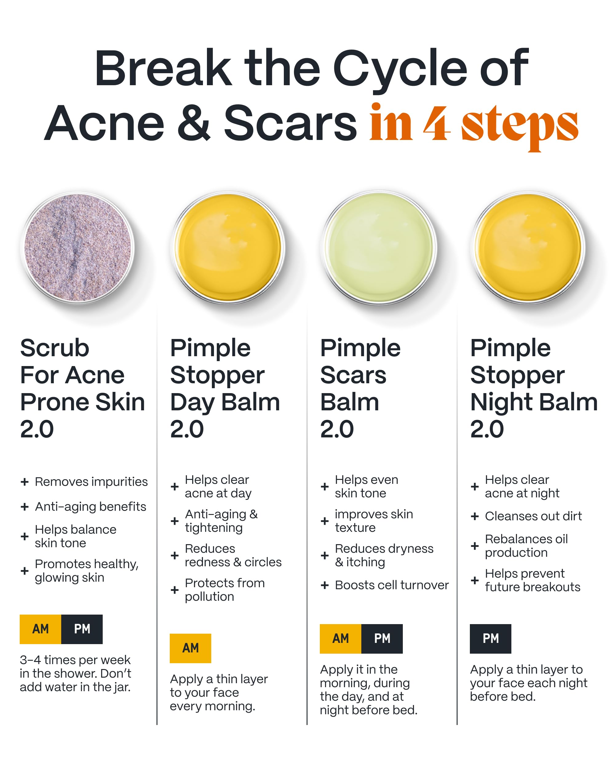EASY 2 MINUTE MORNING AND NIGHT ROUTINE. Apply Day Balm morning and evening, use Night Balm before bed, layer Scar Healer on top twice daily, and use powder Scrub 2 to 3 times weekly in shower by mixing small amount with water in palm, no other products needed for clear skin.