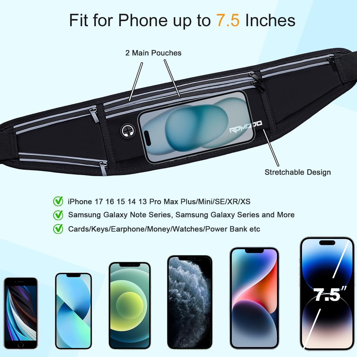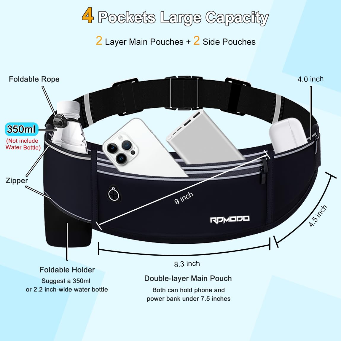 【4 Pockets Large Capacity】The phone holder for running has 4 pockets in total. 2 main pockets in the middle. The upper pocket is 4.0 x 8.0 in(HxL),and the lower pocket stretches from 3.5 to 4.6 x 8.0in(HxL). Both can hold phones or power bank under 7.5 inches. The 2 side pockets are 4.0 x 3.5in, for holding earphone, keys, cards, cash, tissues, etc. The money belt is lightweight so you almost cannot feel it when you put it on.