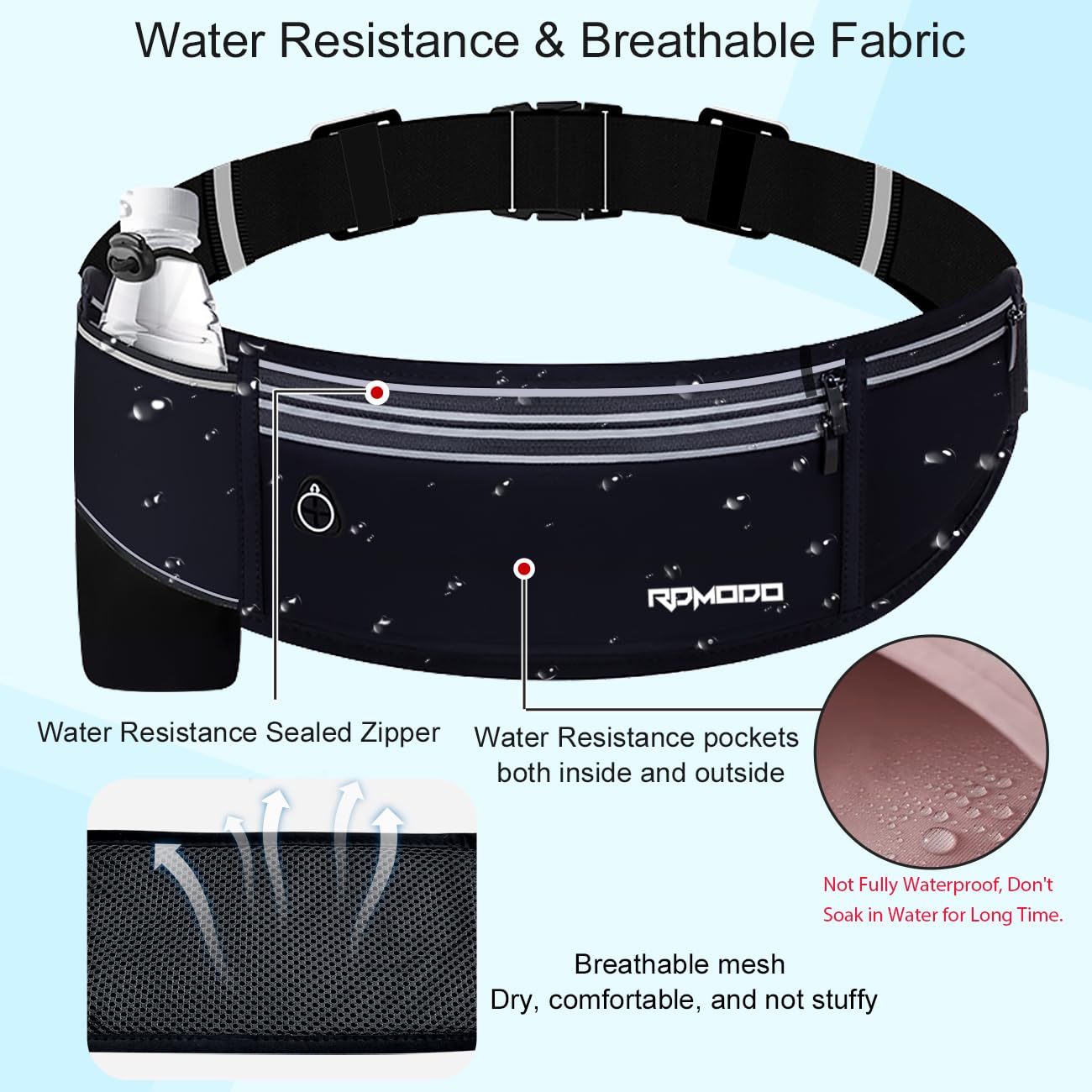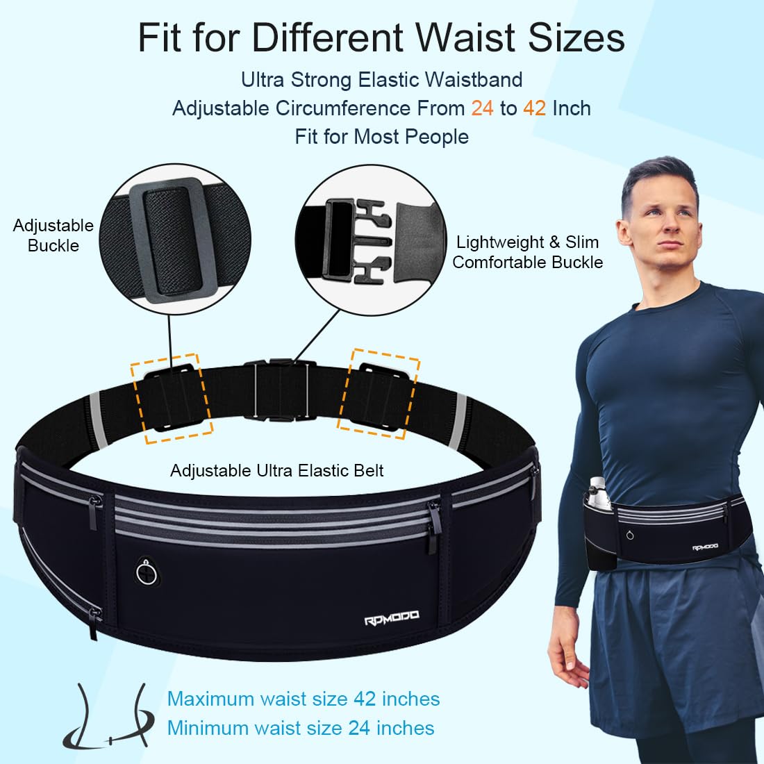 【Adjustable Ultra Elastic Belt】The waist pack runners belt with strong elastic adjustable waistband fit for 24 - 42 inches waistline ensure the hydration belt for walking fixed at the waist, bounce free, not falling or shifting. The elastic band is thinner and softer, making it comfortable to wear without stretching your waist. Its high-performance resilience supports daily stretching and is very durable.
