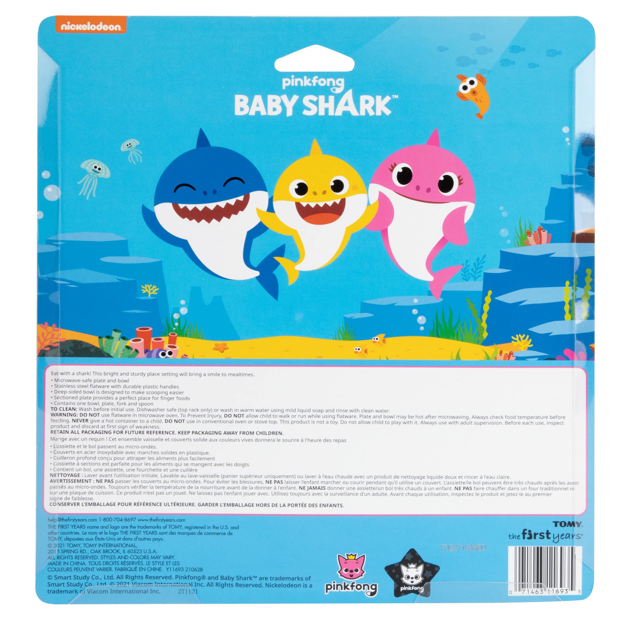 Baby Shark makes mealtimes fun with this four-piece toddler feeding set. Kids will look forward to meals with their favorite friends, and picky eaters will appreciate the divided plate that keeps foods separated. Parents will love that the plate and bowl are both microwave and dishwasher safe for easy meal prep and cleanup. The toddler friendly bowl features deep sides that are designed to make scooping easier for little ones learning to self-feed. The stainless steel flatware is also easy for little hands to grasp with durable plastic handles. Doo, doo, doo, doo, doo doo invite Baby Shark to dinner!