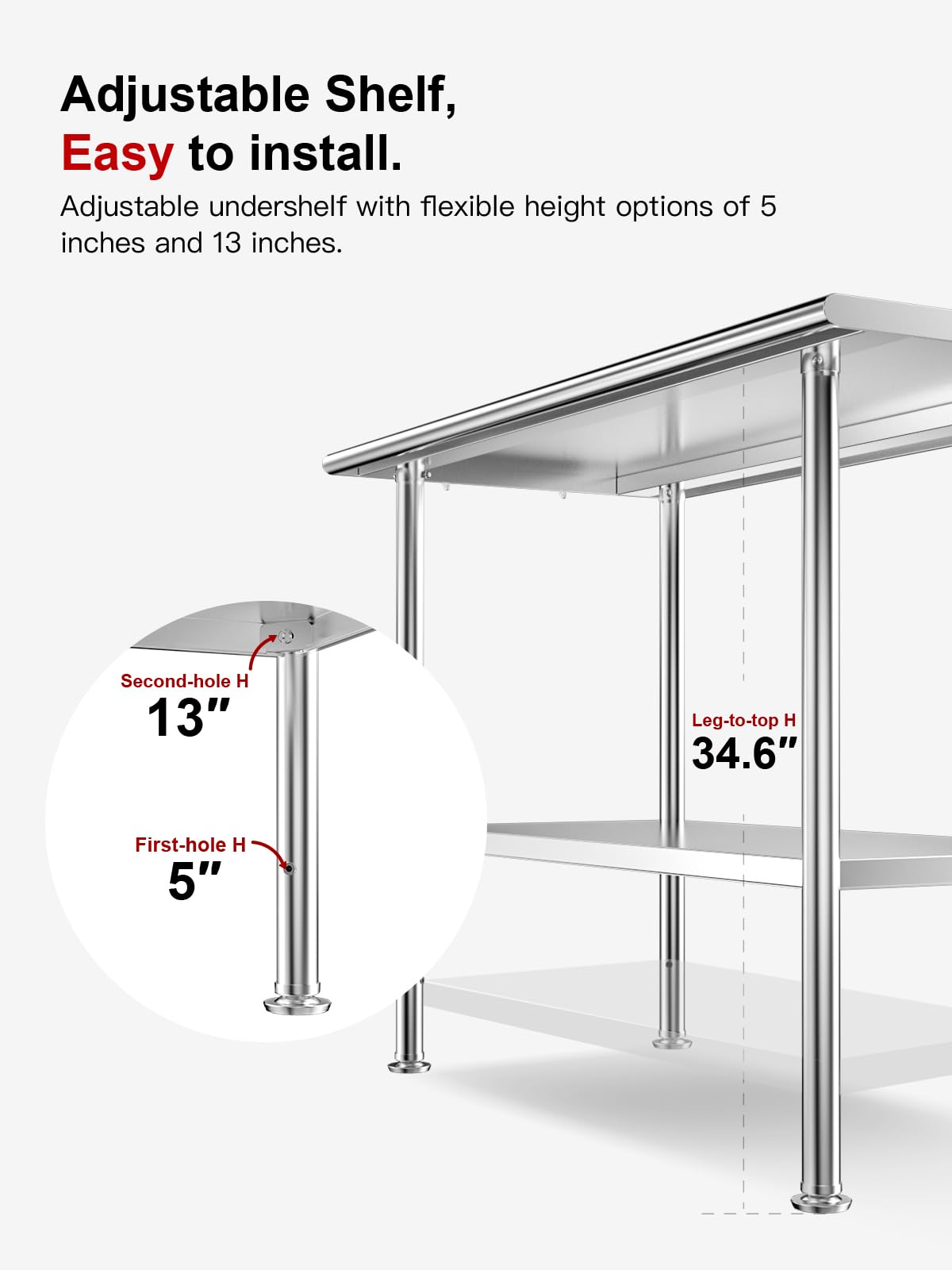 【All-Stainless Steel】Crafted from high-quality 430-grade stainless steel, this table offers superior resistance to rust and corrosion compared to galvanized steel. The polished surface is also easy to clean, ensuring long-lasting performance.