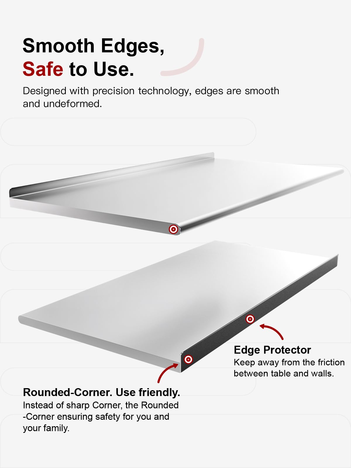 【Improved Manufacturing】Designed with precision welding technology, the backsplash guard and the edges of this stainless table is specially smooth and undeformed.