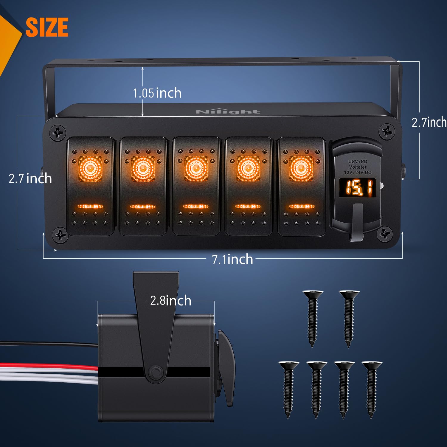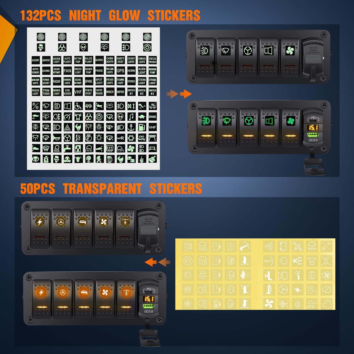 Wide Application: The switches allows you to control up to 5 different devices, such as Led Light Bars, Rear Lights, Rock Lights, Windshield Lights, Off road Lights, Sasquatch Lights, Zombie lights and Wench power, etc. The complimentary transparent and night glow stickers enables you to DIY the switch according to your preference. Package Includes: 5 Gang pre-wired switch box with USB charger and voltmeter, 1X transparent sticker,1X night glow sticker, mounting screws