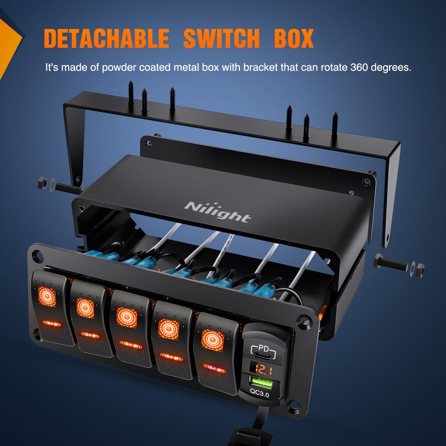 Multi-Function designed: This switch box is integrated with 5pcs 20 amps Rocker switches rated at 12VDC and a QC3.0 dual USB charger with LED voltmeter. Suitable for most 12V-24V DC cars, UTVs/ATVs, trucks, trailers, RVs, caravans, buses, marine boats, yachts etc