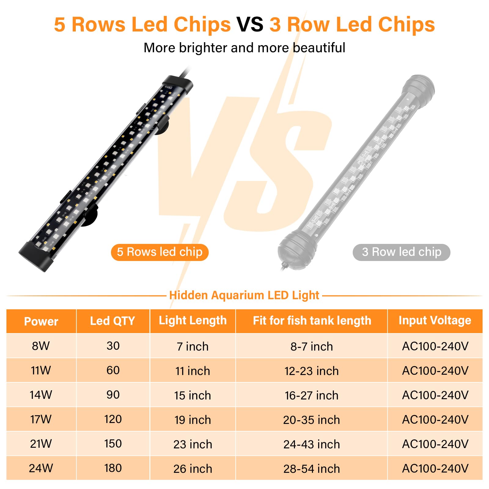 ★[5 columns of Led Chips, High-quality Led]: Compared with other submersible led lights, our lights have up to 5 rows of LED chips, which are brighter and more beautiful. Our fish tank lights use high-quality 2835 + 5050 model lamp beads with a long service life of at least 50,000 hours. Tish ultra bright full-spectrum RGB LEDs can present the vivid colors of aquatic plants and fish, making your fish tank a colorful landscape