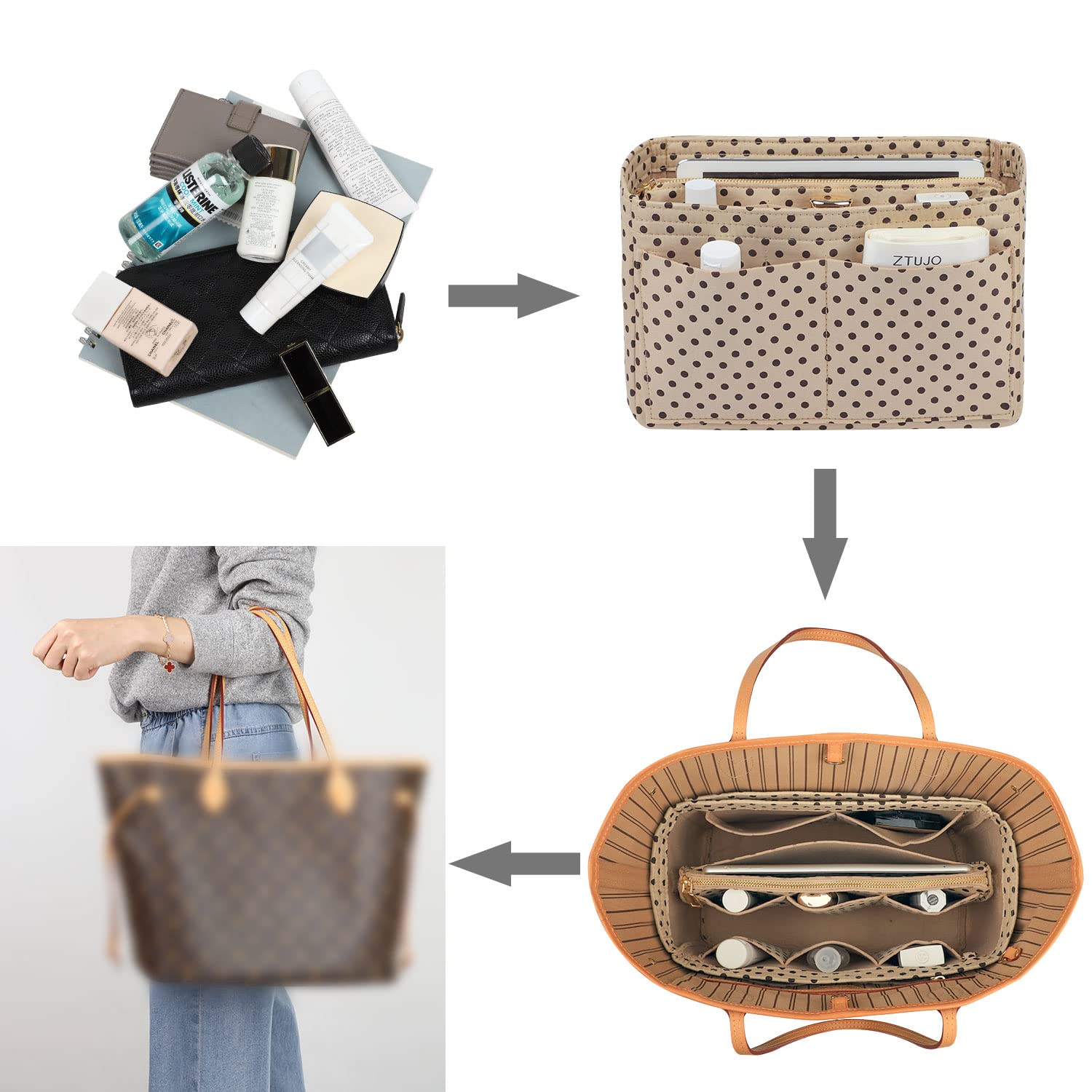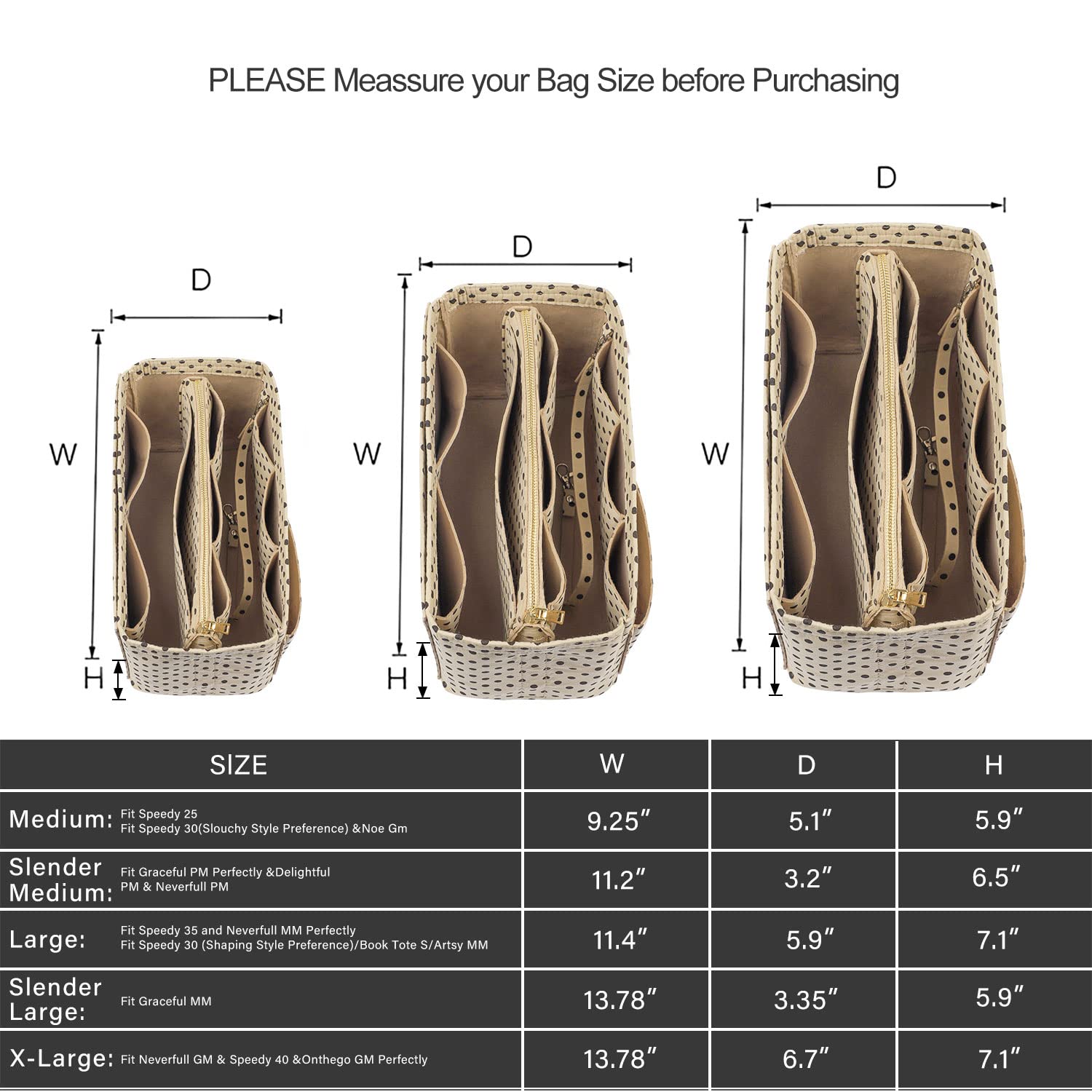 💗Large Purse Organizer: 11.4(W)*7.1(H) *5.9(D)inch Fit Speedy 35 and Neverfull MM Perfectly and Fits Speedy 30 (Shaping Style Preference). Slender Large Purse Organizer : 13.78(W)*5.9(H)*3.35(D)Fit Graceful MM Perfectly.X-Large Purse Organizer:13.4(W)*7.1(H)*6.7(D)inch fits Speedy 40 and Neverfull GM Perfectly. Portable and Compact Purse Perfectly For any Brand. Please kindly Measure the Interior Length, Width and Height of Your Handbag with a Measuring Tape