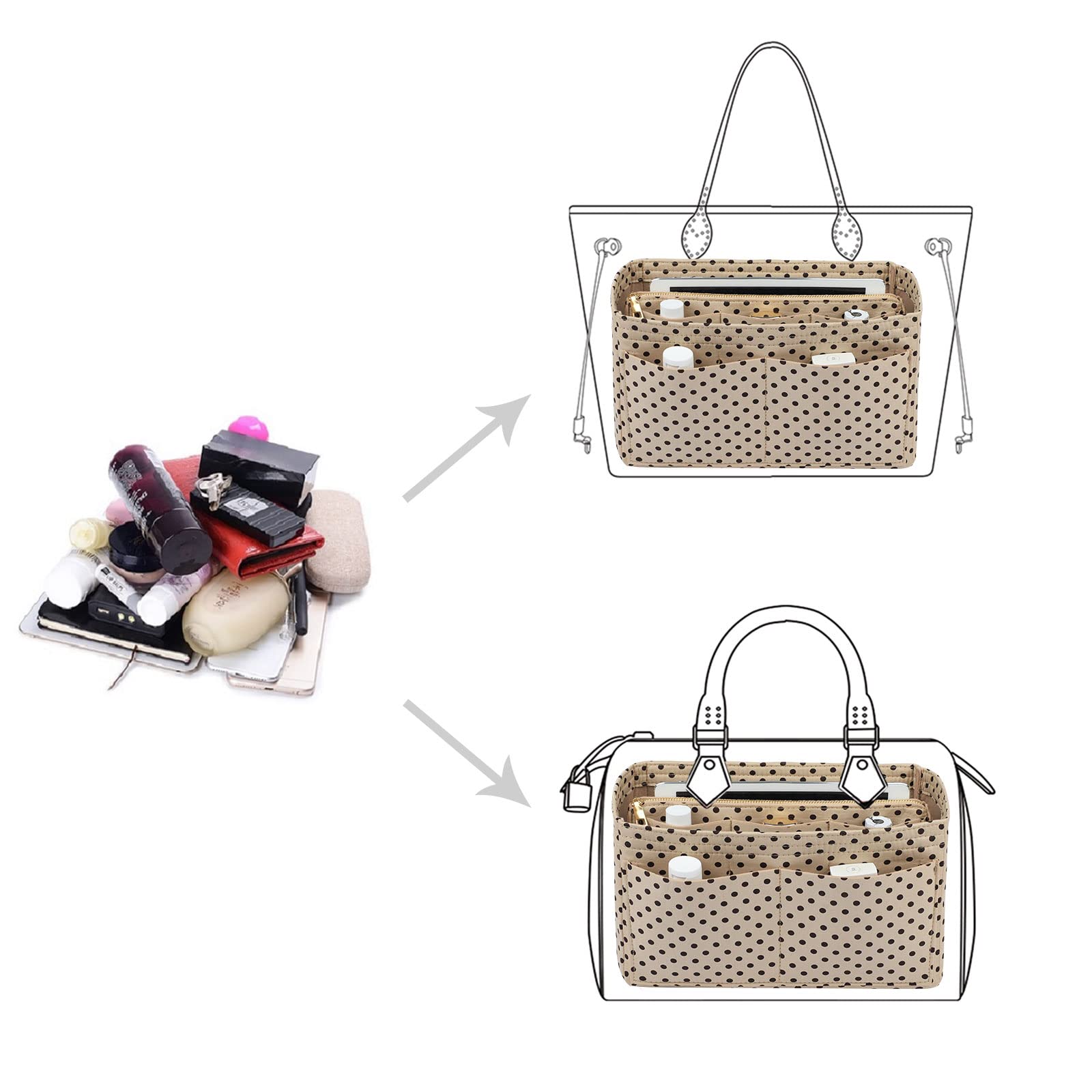 💗SIZE OF BAG ORGANIZER: Mini Purse Organizer: 7.09(W)*5.5(H)*2.75(D) inch Fits Alam BB and Fja-Kanke Mini ;onthego Pm and Montsouris BB. Small Purse Organizer: 8.66(W)*5.3(H)*4.5(D) inch Fits MJ Small Tote, Speedy 25, LC op Handle S and Book Tote New Small. Medium Purse Organizer:9.25(W)*5.9(H)*5.1(D)inch Fits 30 (Slouchy Style Preference). Slender Medium Purse Organizer: 11.2(W)*6.5(H)*3.2(D)inch Fits Graceful PM and Delightful PM