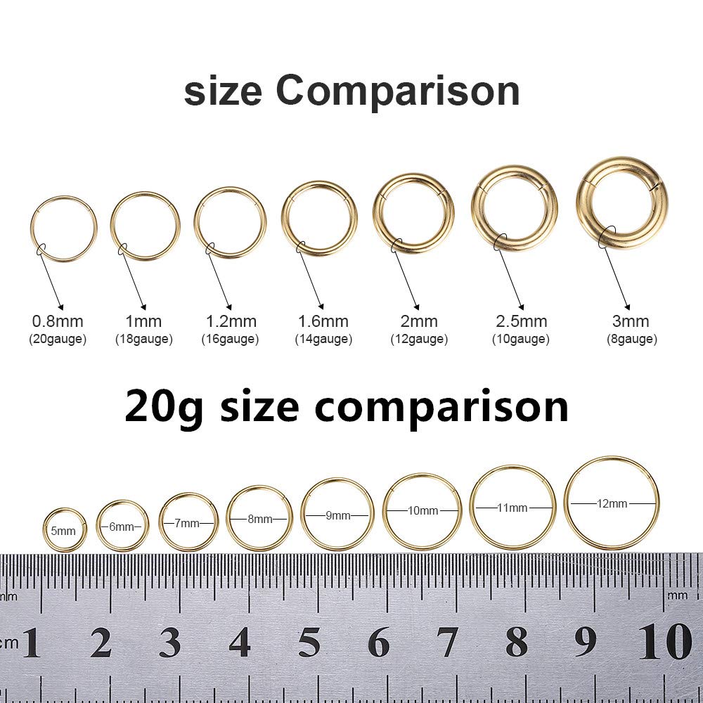 Sold individually Nose Hoop Ring/Earring Hoop Size: 20 gauge (thickness: 0.8mm), inner diameter 5/16 inches(8mm),If your nose is big or your nose piercing is higher, please try to pick larger inner diameter.If your nose is small or your nose piercing is lower, please try to pick smaller inner diameter.Please choose your gauge and diameter hoop for your nose piercing needs.It has a smooth closure that doesn't slipped or opened. It's still tight after long-term use.
