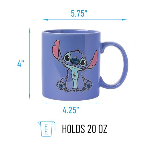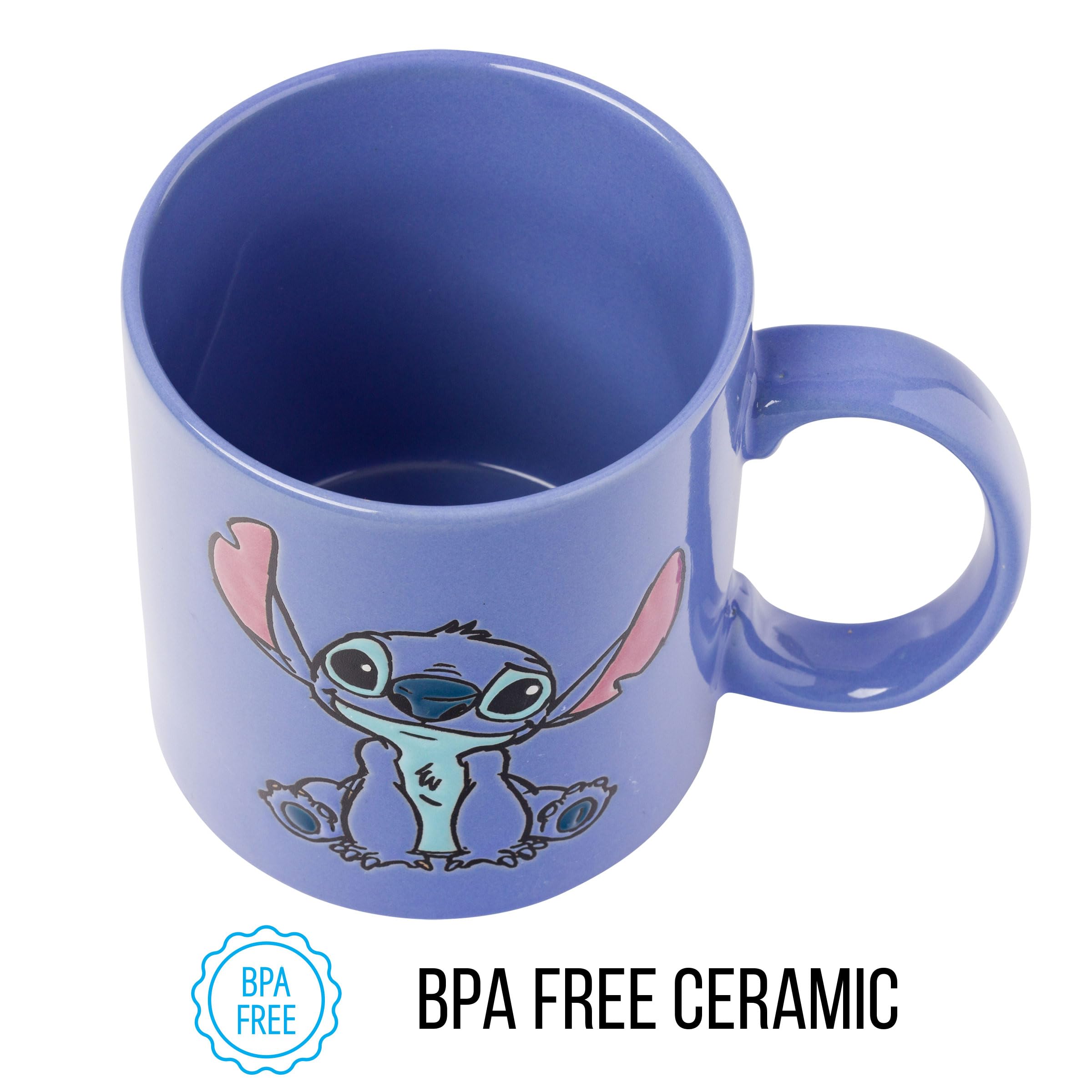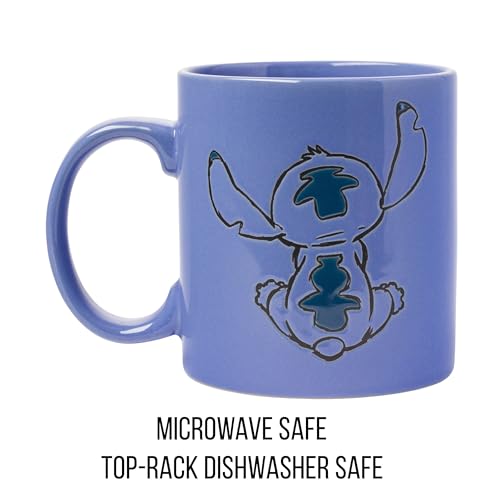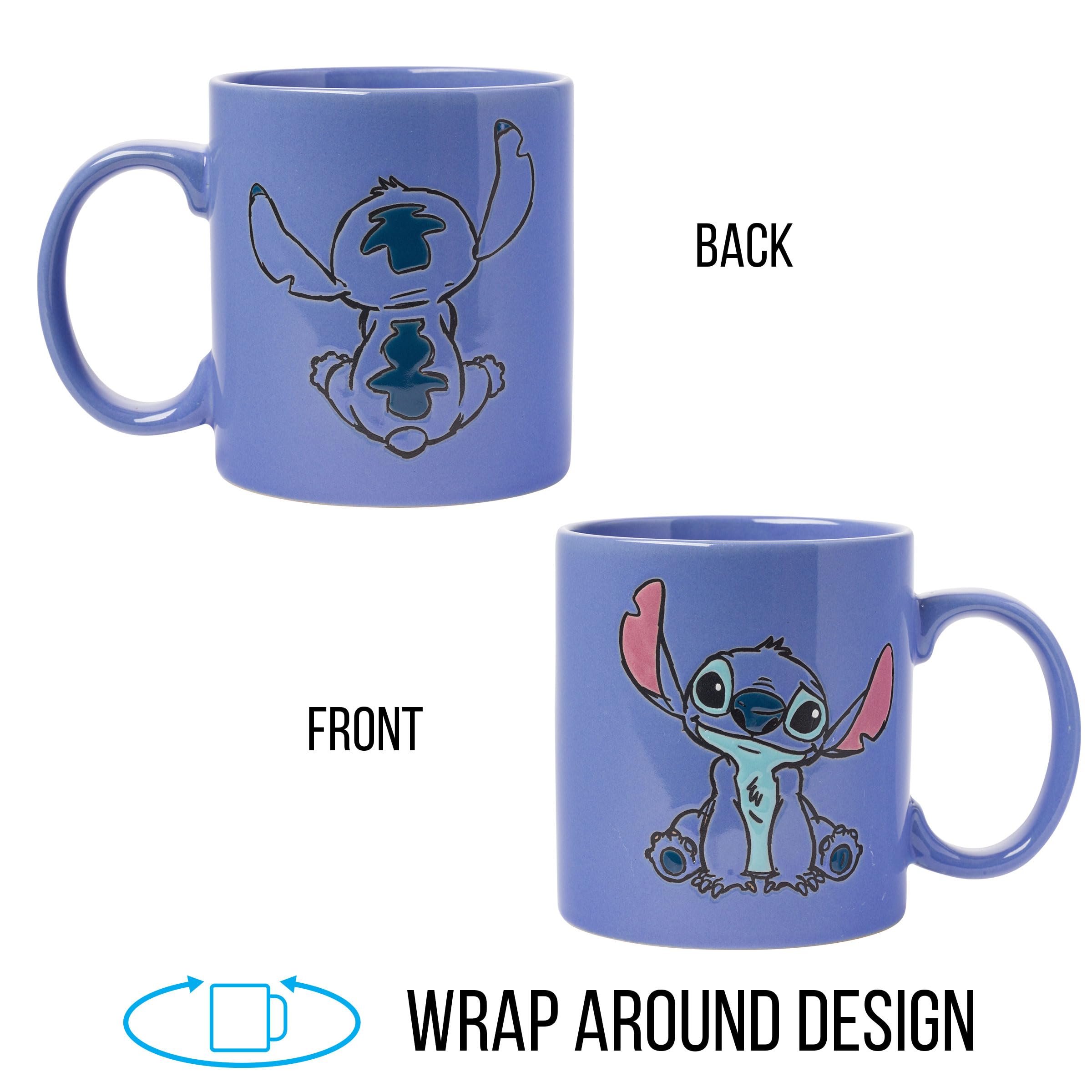 WAX RESIST CERAMIC MUG: Enjoy your coffee or tea in this adorable Lilo & Stitch 20oz. Wax Resist Ceramic Mug. Featuring a front view of Stitch on the front of the mug, and a back view of Stitch on the back of the mug against a blue background