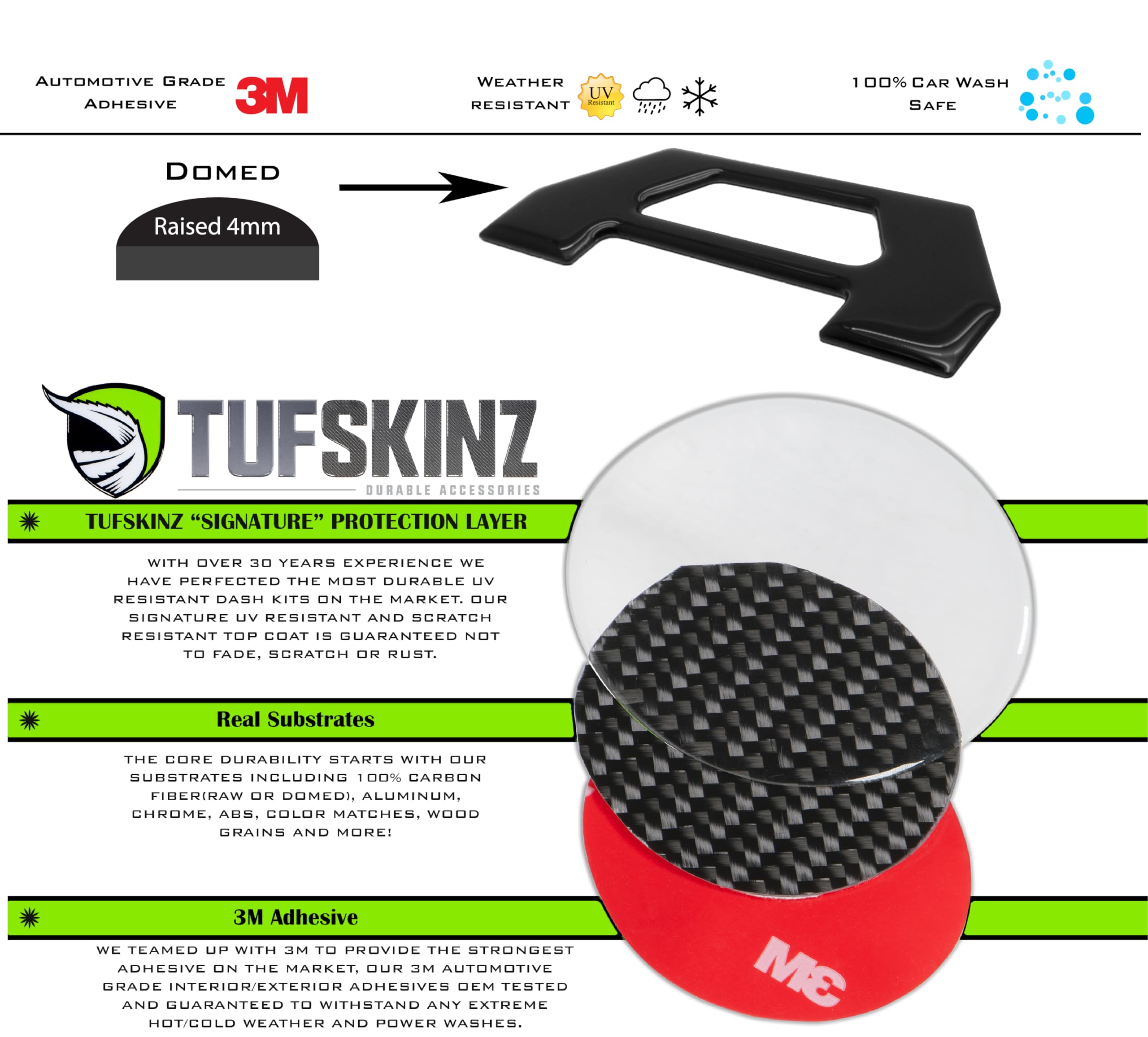 Designed to last the lifetime of your vehicle. Durable accessory that is resistant to the elements including weather and carwashes. Our Domed product line is manufactured using our 3-layer process which starts with a substrate such as colored ABS plastic or REAL Carbon Fiber. The product is then topped with a superior UV resin (except Raw Carbon Fiber) to protect the product from discoloration or fading from any elements. It is then back with 3M Grade Automotive Adhesive for a secure bond.