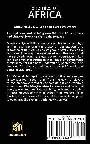 Winner of The Literary Titan Gold Book Award! "Enemies of Africa is a well-researched and planned work of pure fact. I thought I knew a lot about the slave trade, but there is so much that the history classes left out. This eye-opening book filled in all the blanks, and I am more educated on the slave trade now than I ever was by a textbook." - Literary Titan "What I liked most about this book is that the author kept me interested throughout the book. This book was filled with history lessons that were both gut-wrenching and fascinating." - OnlineBookClub.org "A robust overview of Europe’s history of racism and exploitation." - Kirkus Review A gripping exposé, shining new light on Africa’s users and abusers, from the past to the present. Enemies of Africa delivers an eye-opening narrative highlighting the monumental scope of exploitation and ill-treatment both Africa and its people have suffered for centuries. Exploring the varieties of Anti-Africanism that have evolved through the ages, author Jaiden Baynes highlights an array of institutions, individuals, and systematic establishments that have undermined, persecuted, and enslaved Africans both within and beyond The Mother Continent's shores. Africa's indelible imprint on modern civilization emerges as we journey through time, from the dawn of slavery to contemporary remnants of colonialism and resource exploitation. Divulging the historical events and facts that many oppressors would want to bury, and some have tried to burn, Enemies of Africa delivers a timeless account of Black History. Discover the story of Africa and be inspired to overcome the systems designed to oppress. About the Author Jaiden Baynes is an award-winning author from Ontario, Canada, known for his thought-provoking writing that challenges the status quo. Jaiden’s writing reflects his commitment to anti-hierarchy and pro-equality values and his belief that absolute power corrupts absolutely, that might does not make right, and that order without justice is useless. He has a talent for combining his knowledge of history and his vivid imagination to create compelling stories that entertain and enlighten readers of all ages and backgrounds.