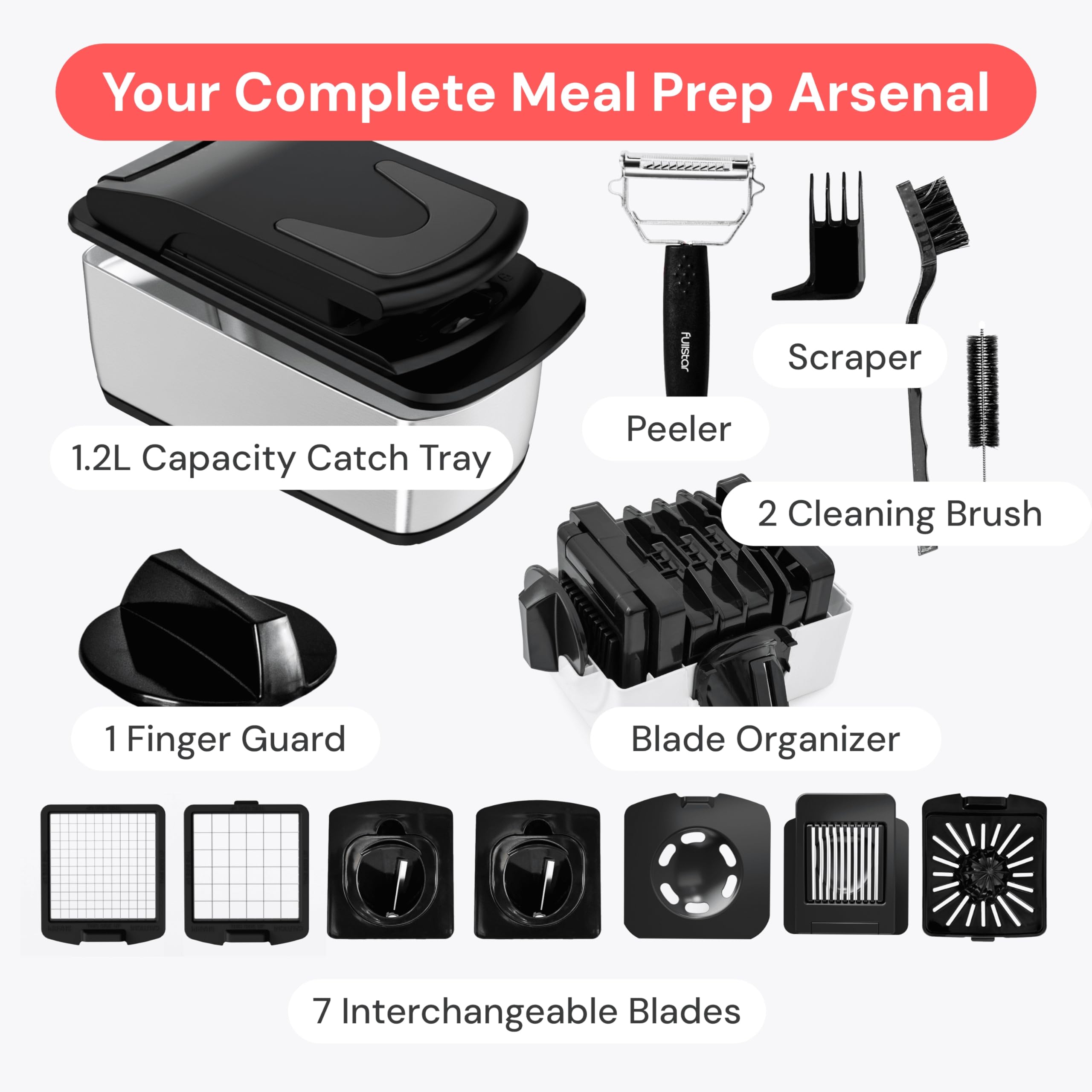 5-Star Design for Everyday Cooking – Built for comfort and precision. The soft-grip TPU handle offers better control, while the non-skid rubber base keeps this BPA-free food chopper stable on any surface. Its built-in catch tray keeps counters clean — making it a perfect house warming gift!