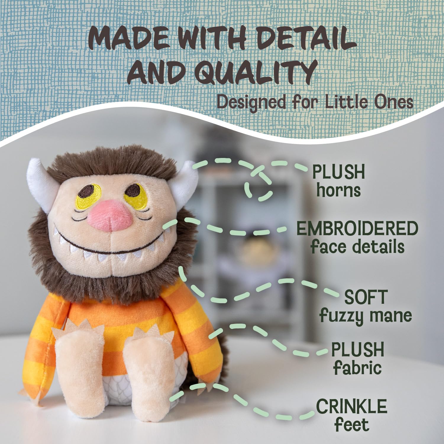 DETAILS: Inspired by "Where The Wild Things Are," Moishe stands 9 inches tall, featuring crinkle feet and a removable hood. This plush toy captures the essence of the classic tale and is perfect for fans of the book.