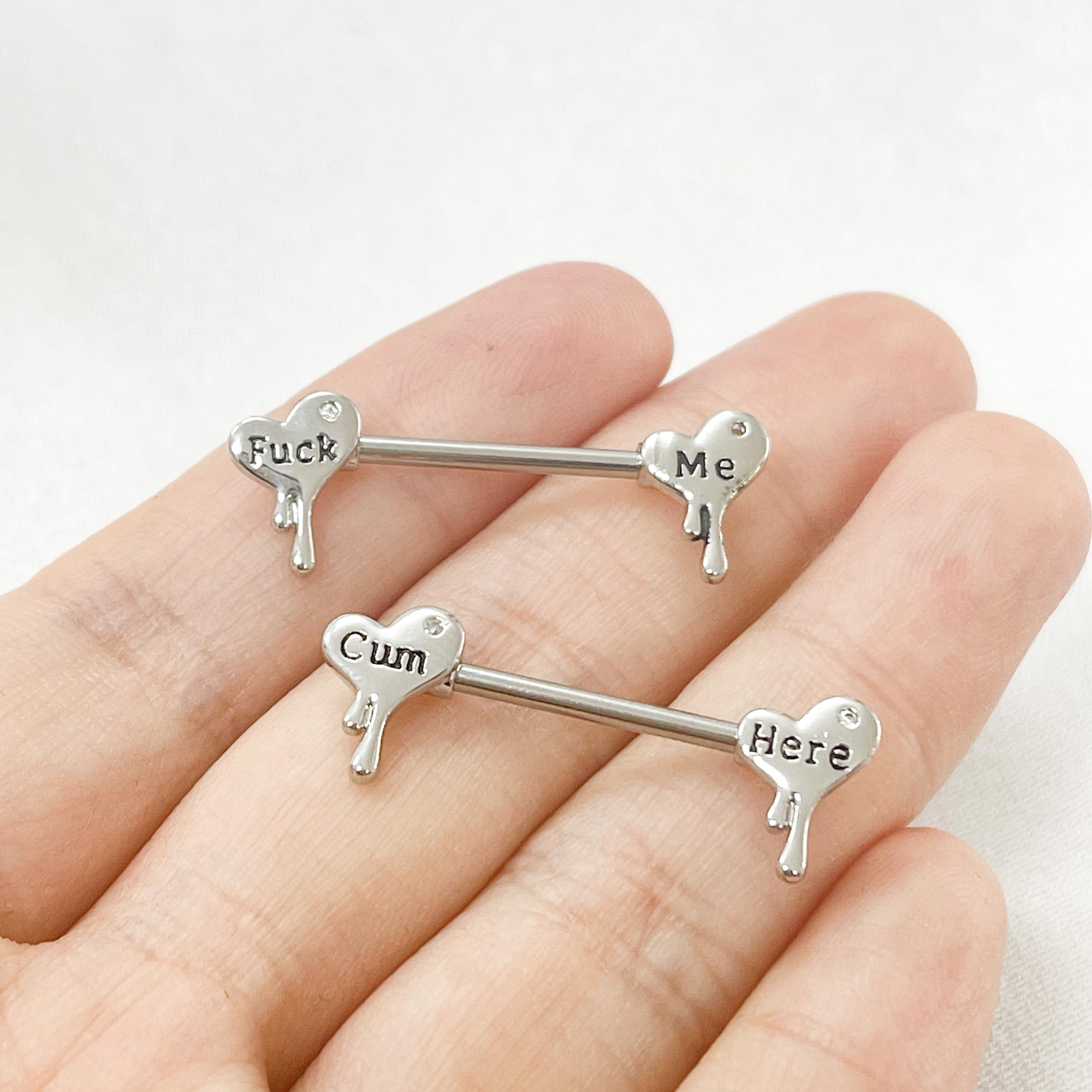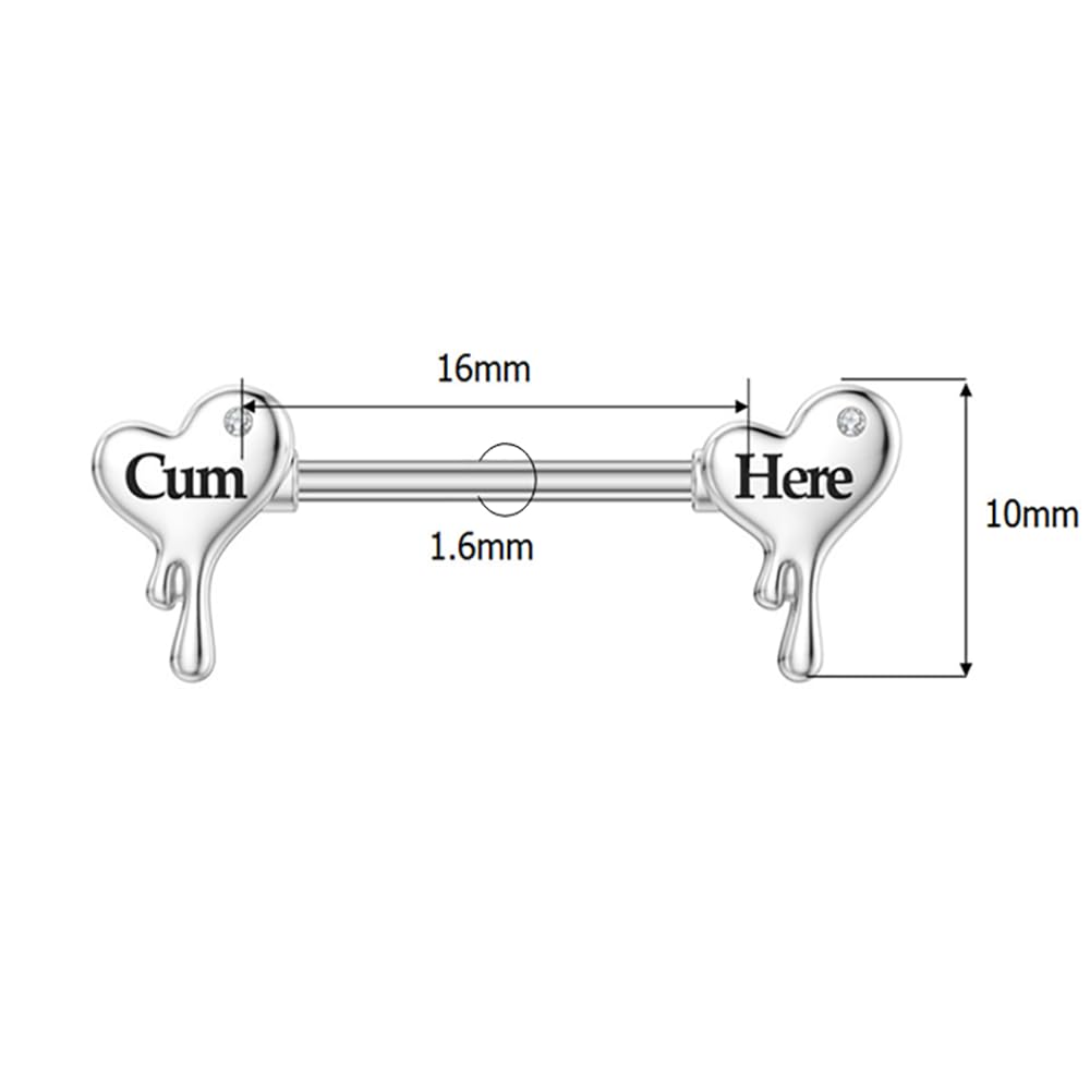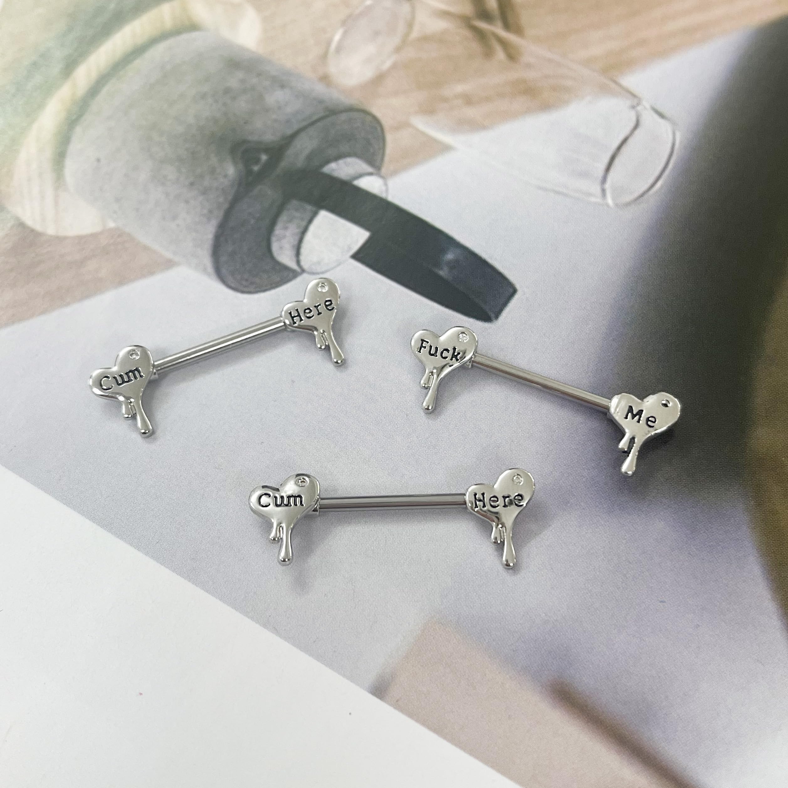 Chic Shape: These stainless steel nipplerings are designed in adorable heart shape, engraved with naughty words as picture shown, fashionable and cute in appearance, you can be more sexy and attractive with these delicate barbells.