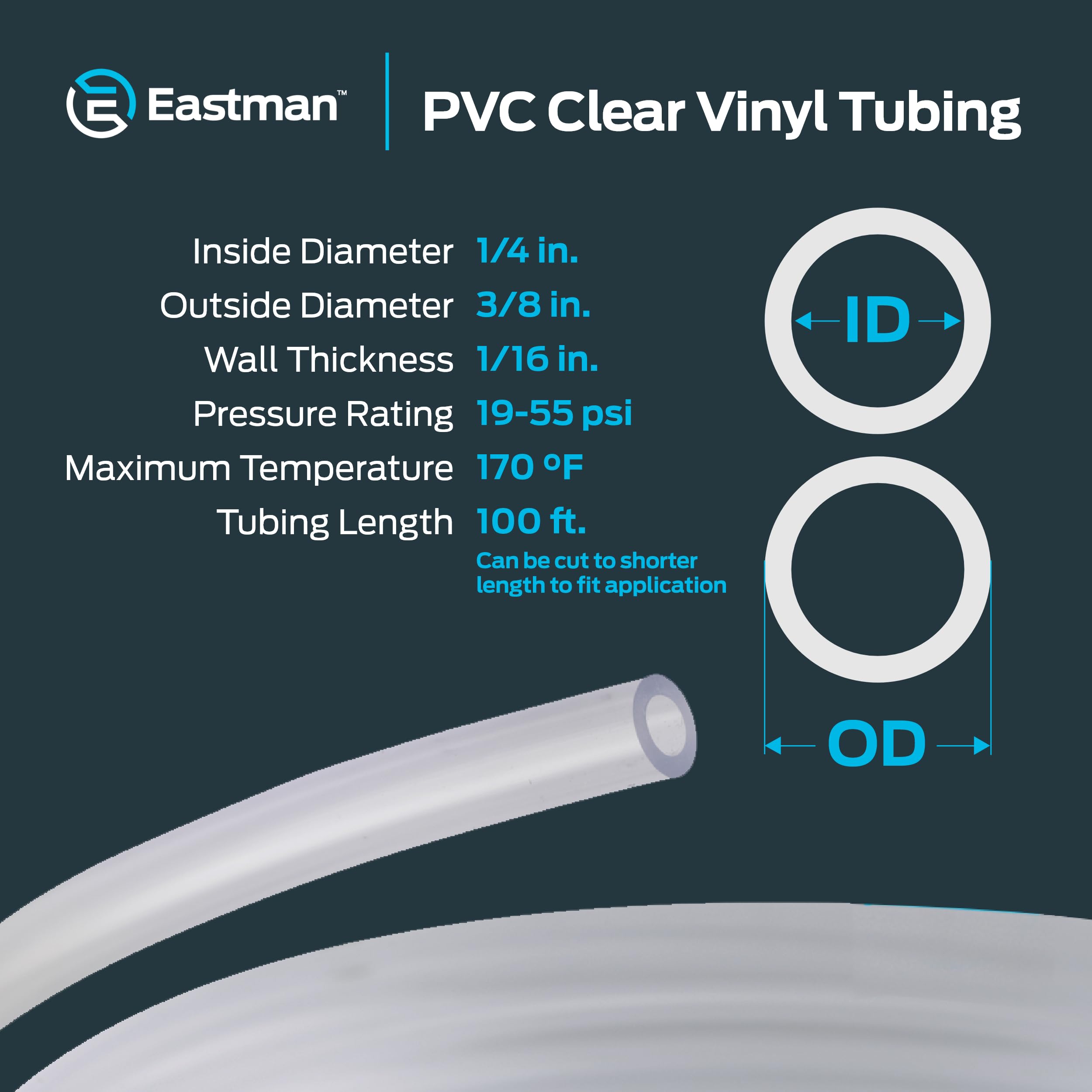 Simplify your plumbing and home improvement projects with the Eastman PVC clear vinyl tubing. Composed of clear, durable PVC, this tubing can be cut to size as needed and is suitable for drainage lines, potable water, beverage dispensing, laboratory use, and aquarium setups. Clear vinyl tubing is a flexible, versatile option that handles chemicals, gases, and liquids in low-pressure applications. Tubing wall thickness is 1/16 inches with a pressure rating of 19 to 55 PSI and a maximum temperature of 170 degrees F. Made with FDA-compliant materials. Not recommended for ice makers.