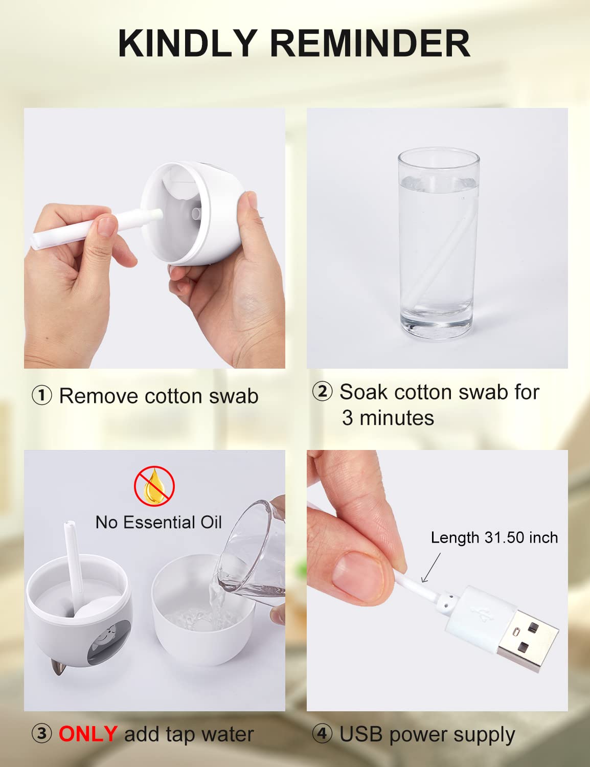 【☆Kindly Reminder】✔️Only tap water could be used for this humidifier. Don’t use pure water ,distilled water, mineral water or essential oil, which will cause water to accumulate in the mist outlet. ✔️Completely soak the cotton filter core for A FEW minutes before use. Otherwise it will not start or the spray volume will be small. ✔️Any problem, please feel free to contact with us.