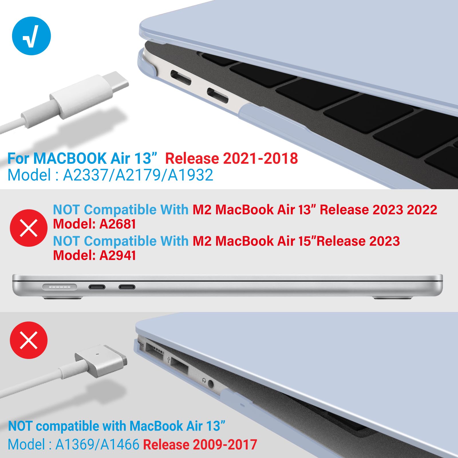 Check Your Model: This case is specifically designed for the MacBook Air 13 inch 2022 2021 2020 2019 2018 Release with Touch ID; Models: M1 A2337 A2179 A1932 MVFH2LL/A, MVFM2LL/A, MVFK2LL/A, MVFJ2LL/A, MVFN2LL/A, MVFL2LL/A, MREE2LL/A, MREC2LL/A, MRE82LL/A, MREA2LL/A, MREF2LL/A, MRE92LL/A.